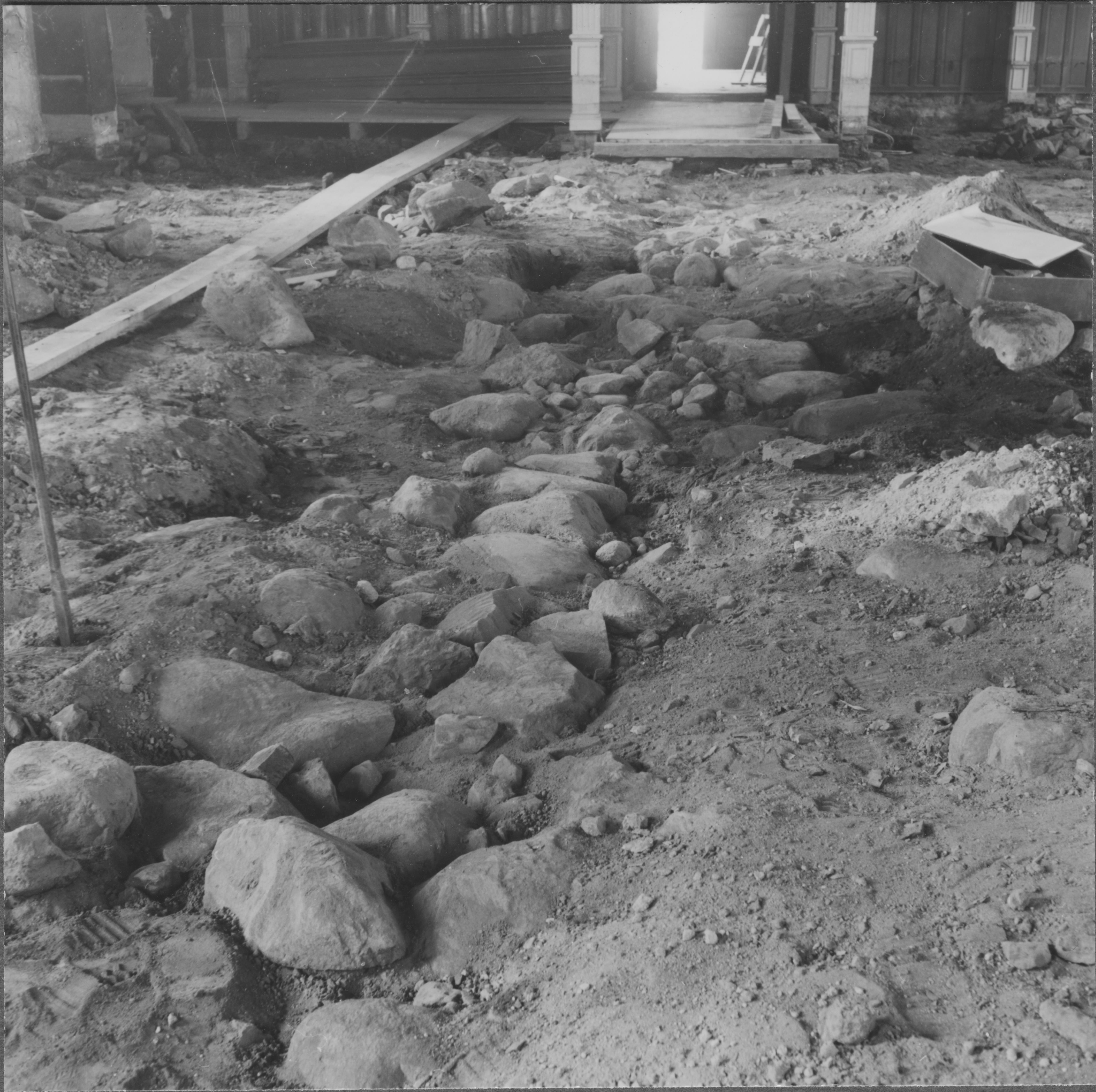 Beskrivning: Romanska kyrkans norra grundmur med det smalare koret närmast, intill denna till höger 1300-talskorets grundmur.