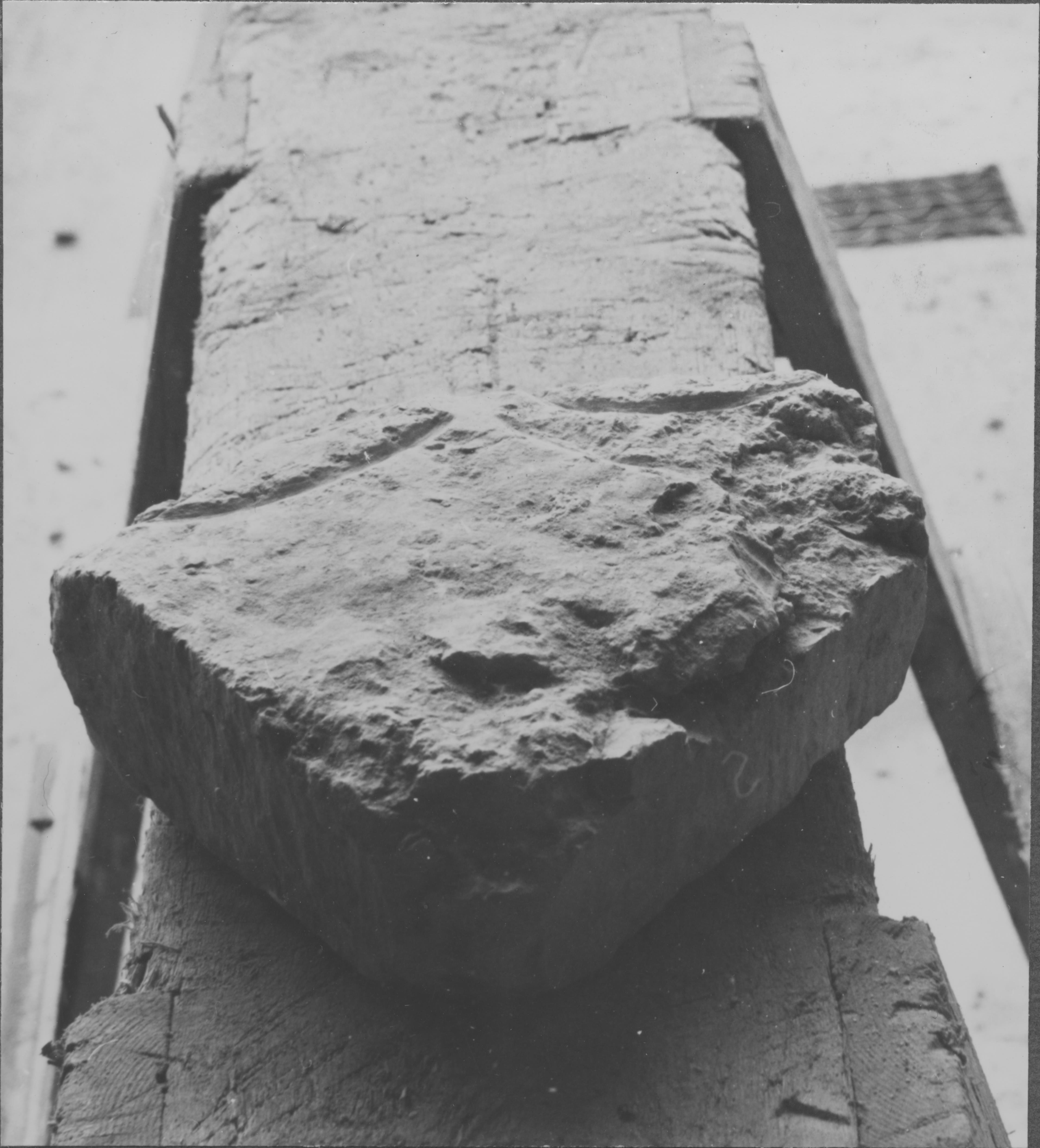 Beskrivning: Topp till gavelhäll av ornerad kalkstenskista.
