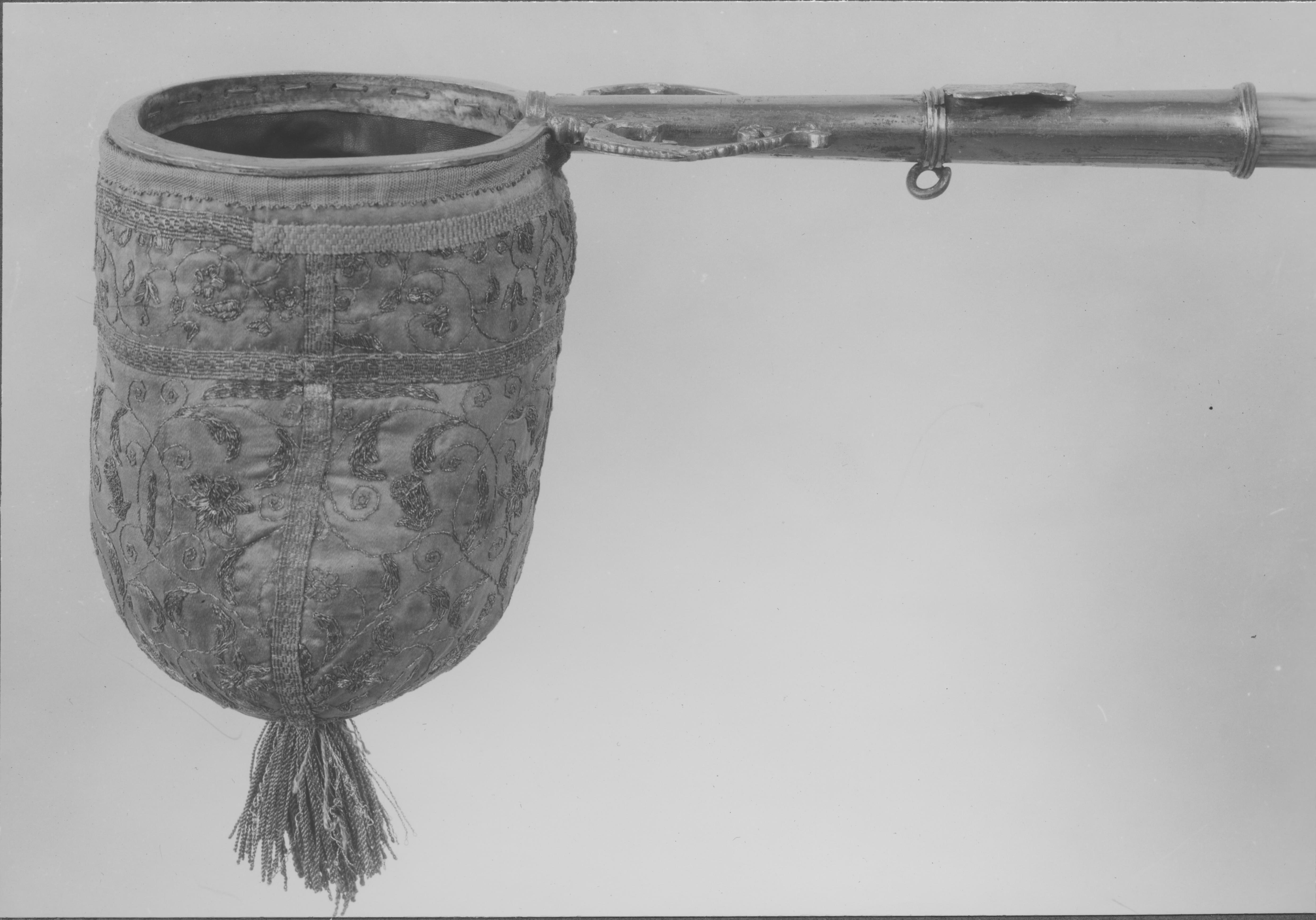 Beskrivning: Håv med broderade bladslingor. Pietas 3533/1957. Efter konservering.