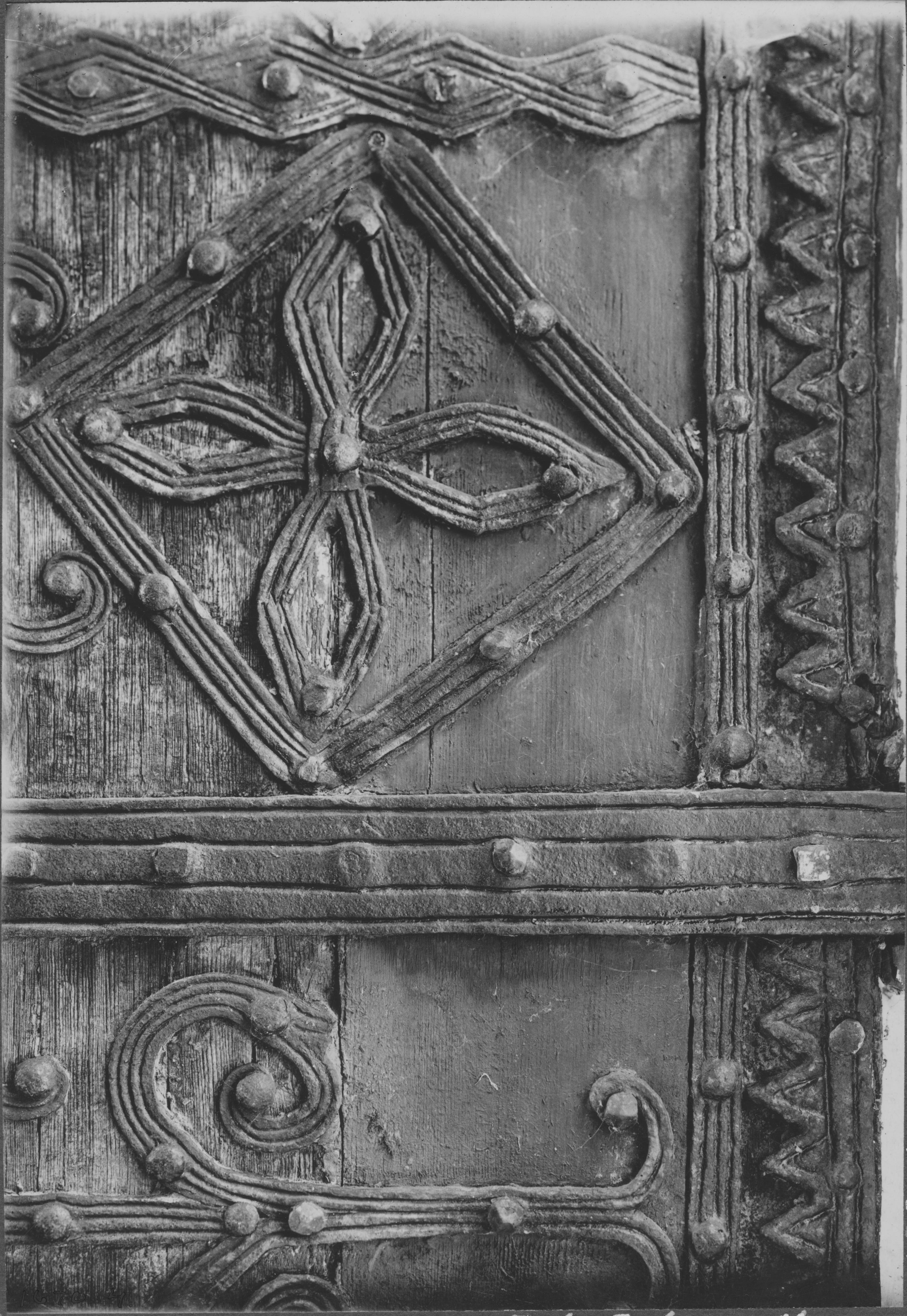 Beskrivning: Detalj av järnbeslagen port i Bielkes gravkor.