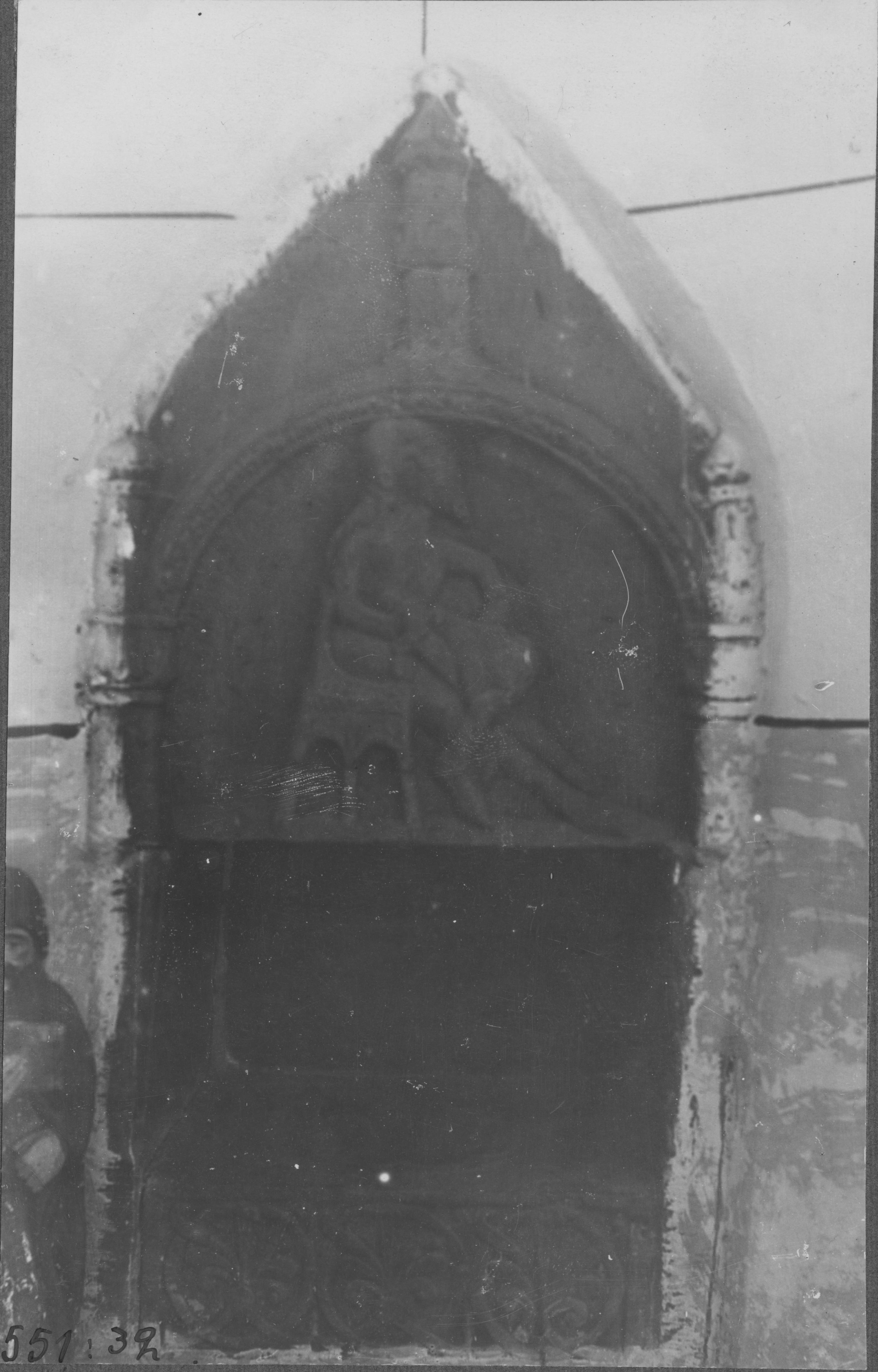 Beskrivning: Piscina i vapenhusets södra hörn. Från 1200-talet. Över piscinan finns en relief visande en elegant riddare från 1100-talet.