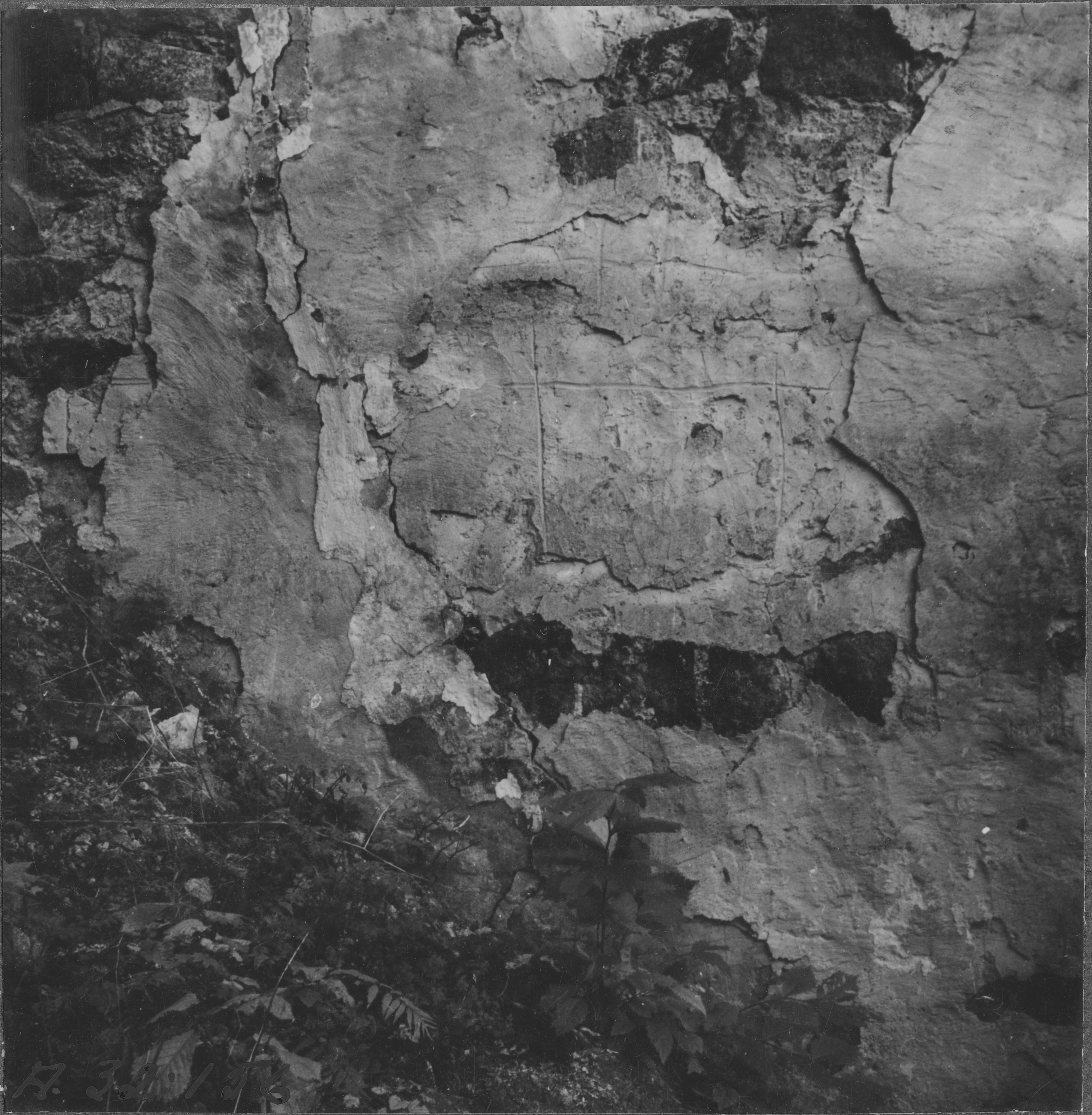 Beskrivning: Kvaderritsning på norra murens insida mellan fönstret och västra gaveln.