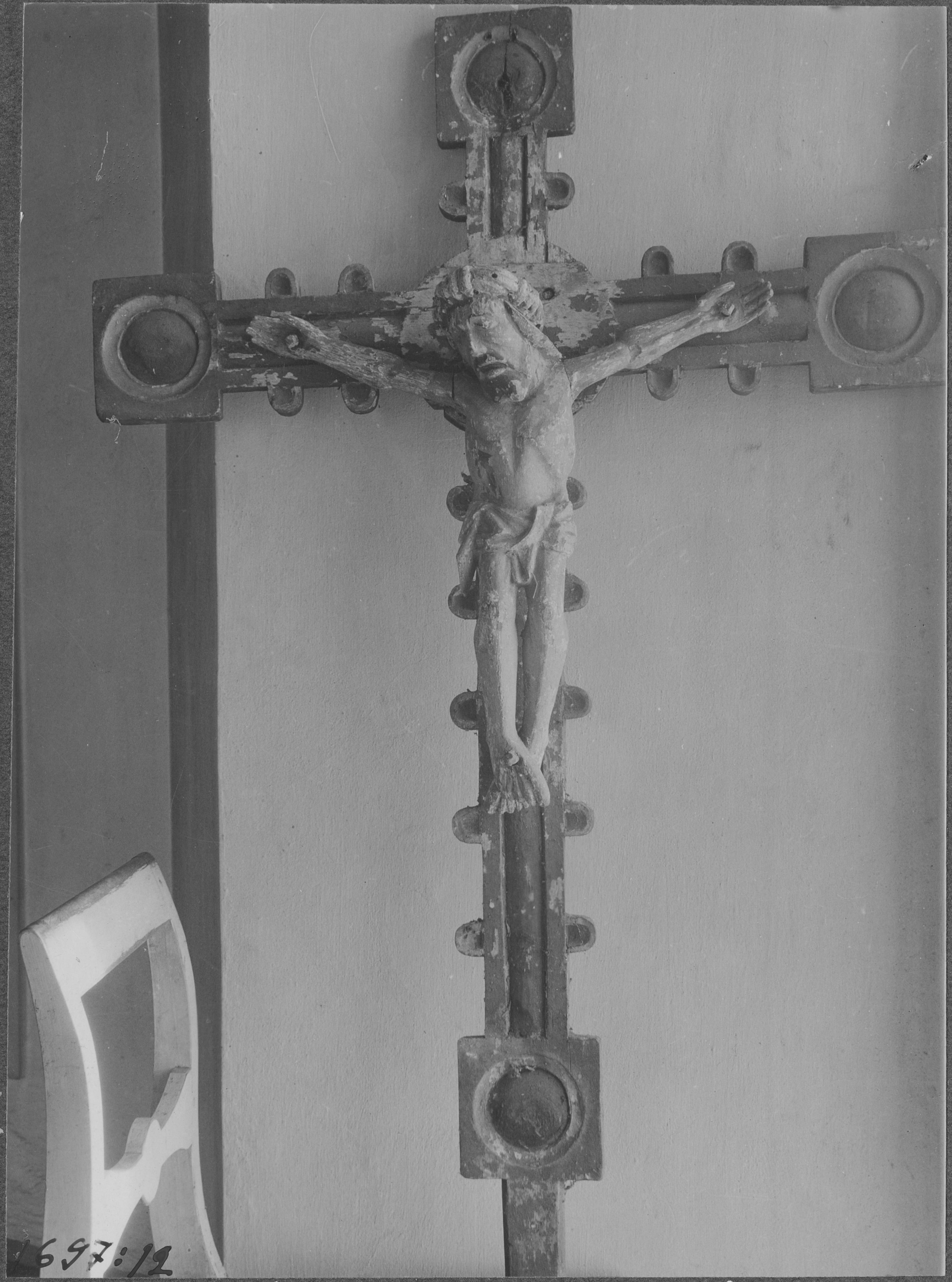 Beskrivning: Processionskrucifix av trä. 1400-taelt. Från Västra Skrukeby kyrka. Linköpings Museum.