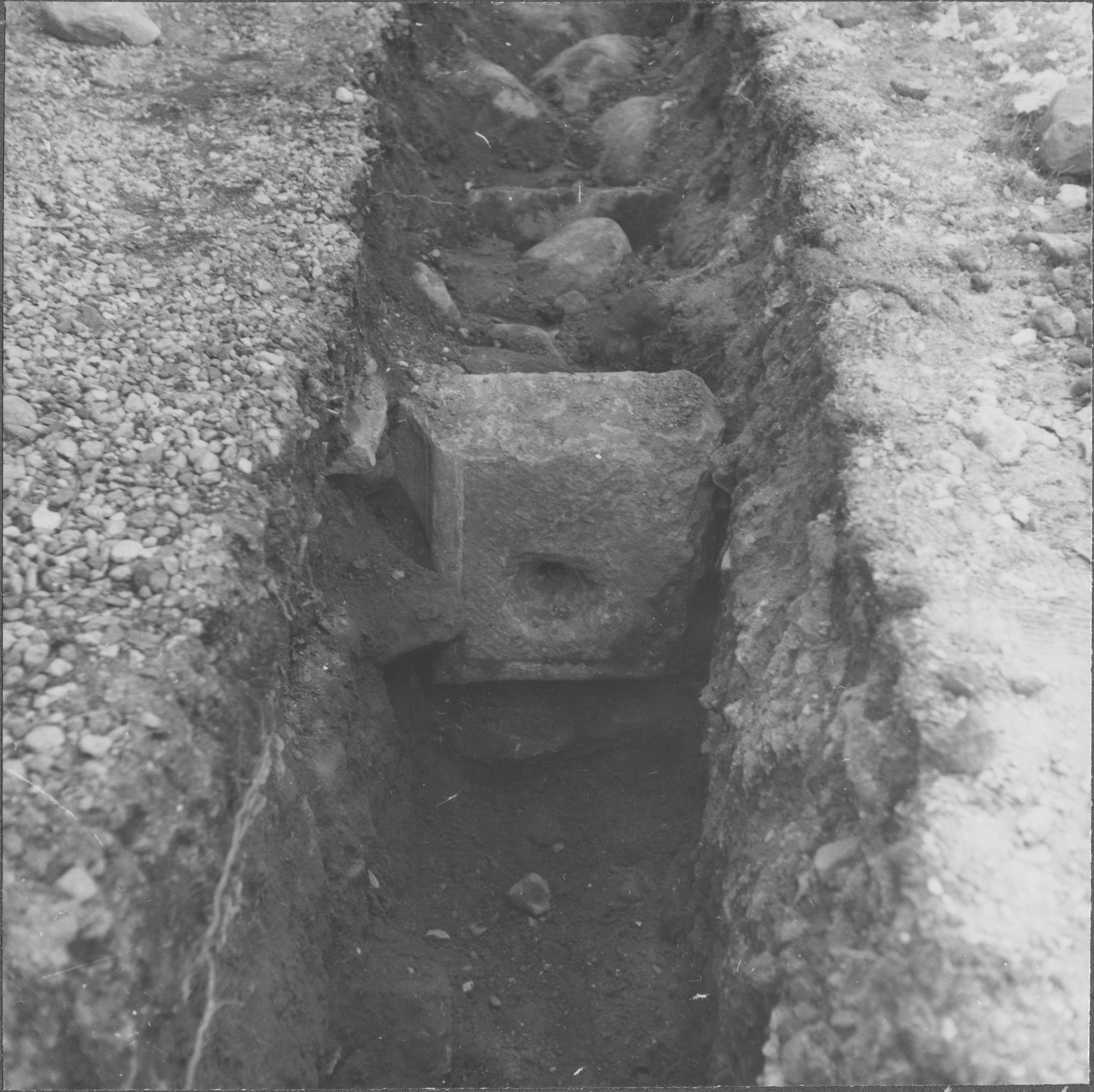 Beskrivning: Sakristians västmur med eldstadsgrund och piscina (?). Från öster.