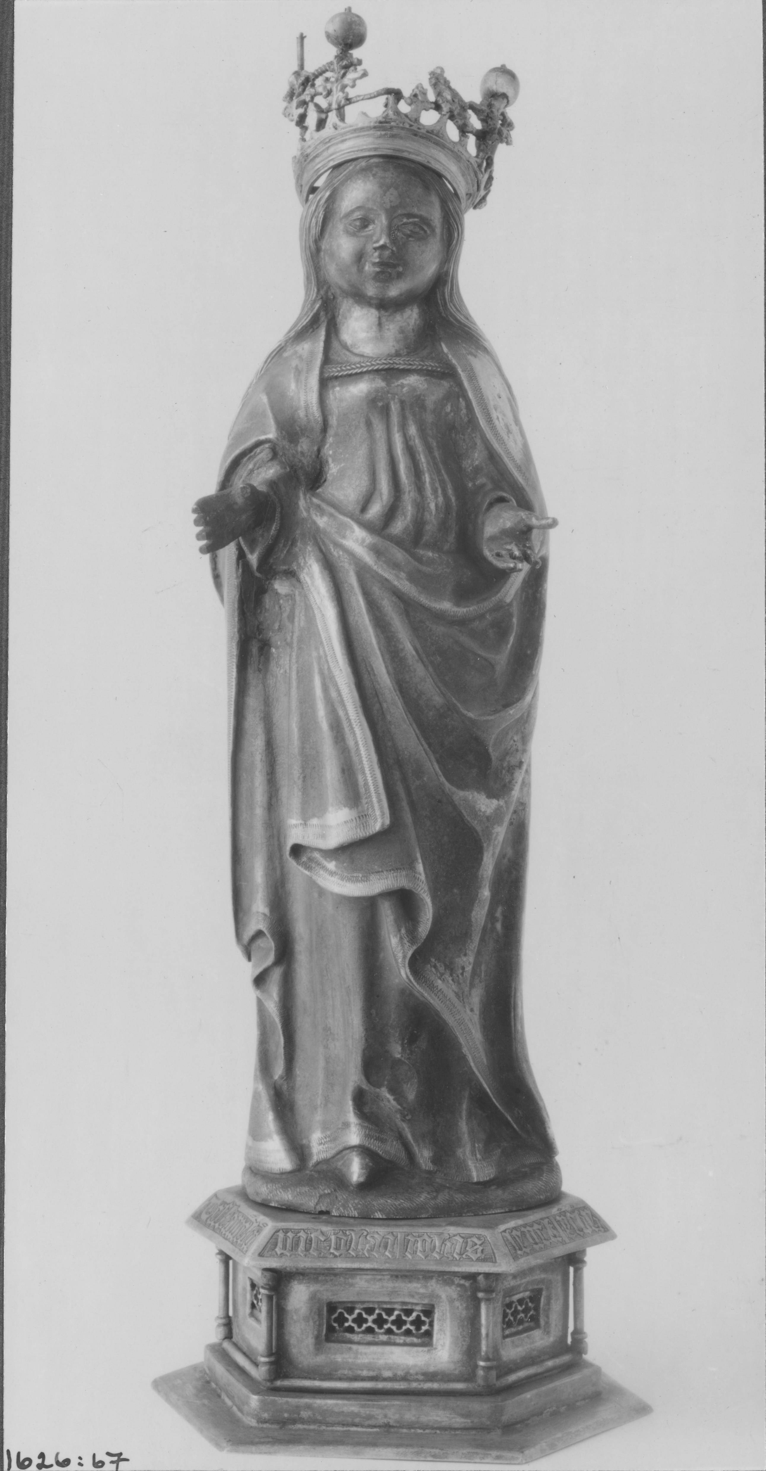 Beskrivning: Relikvarium av silver i form av en bild av S Katarina av Alexandria.