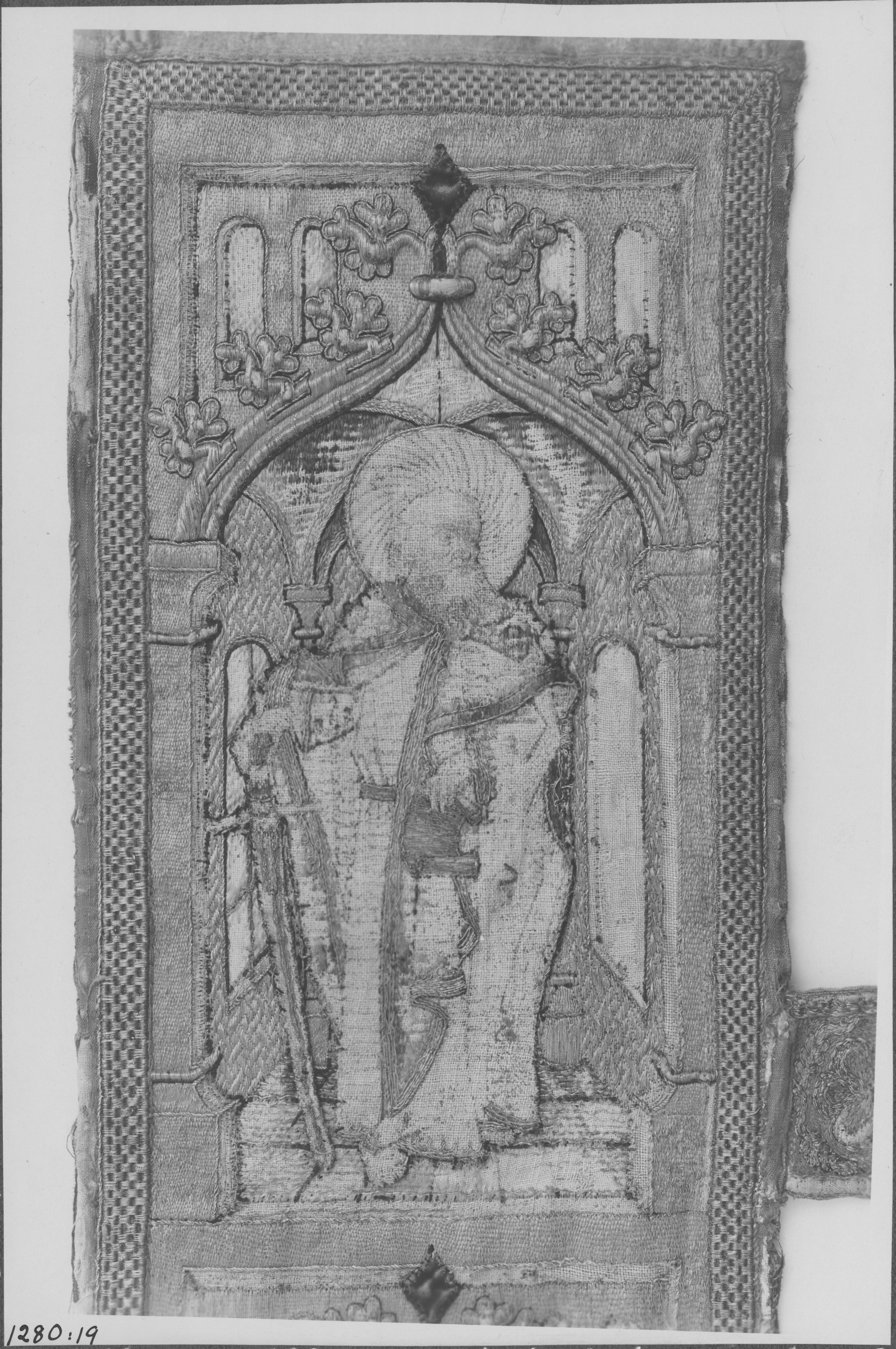 Beskrivning: Korkåpebräm, broderat, detalj. Senmedeltid-1500-tal. Textilutställningen i Stockholm 1929. Nummer 122. "Medeltida vävnader och broderier i Sverige".