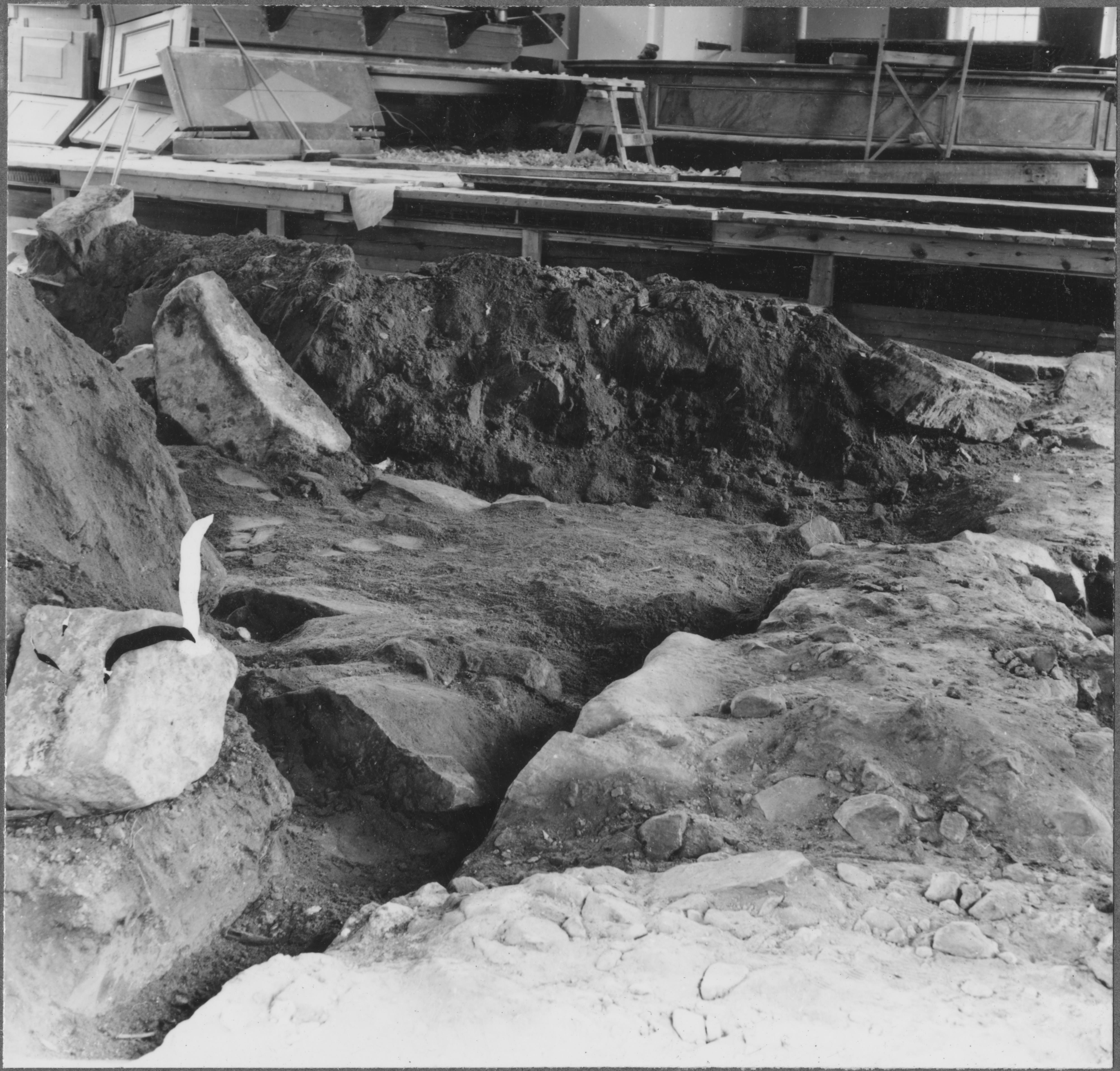 Beskrivning: Korets ursprungliga östra mur med anslutning till södra muren. I förgrunden pilastergrund.