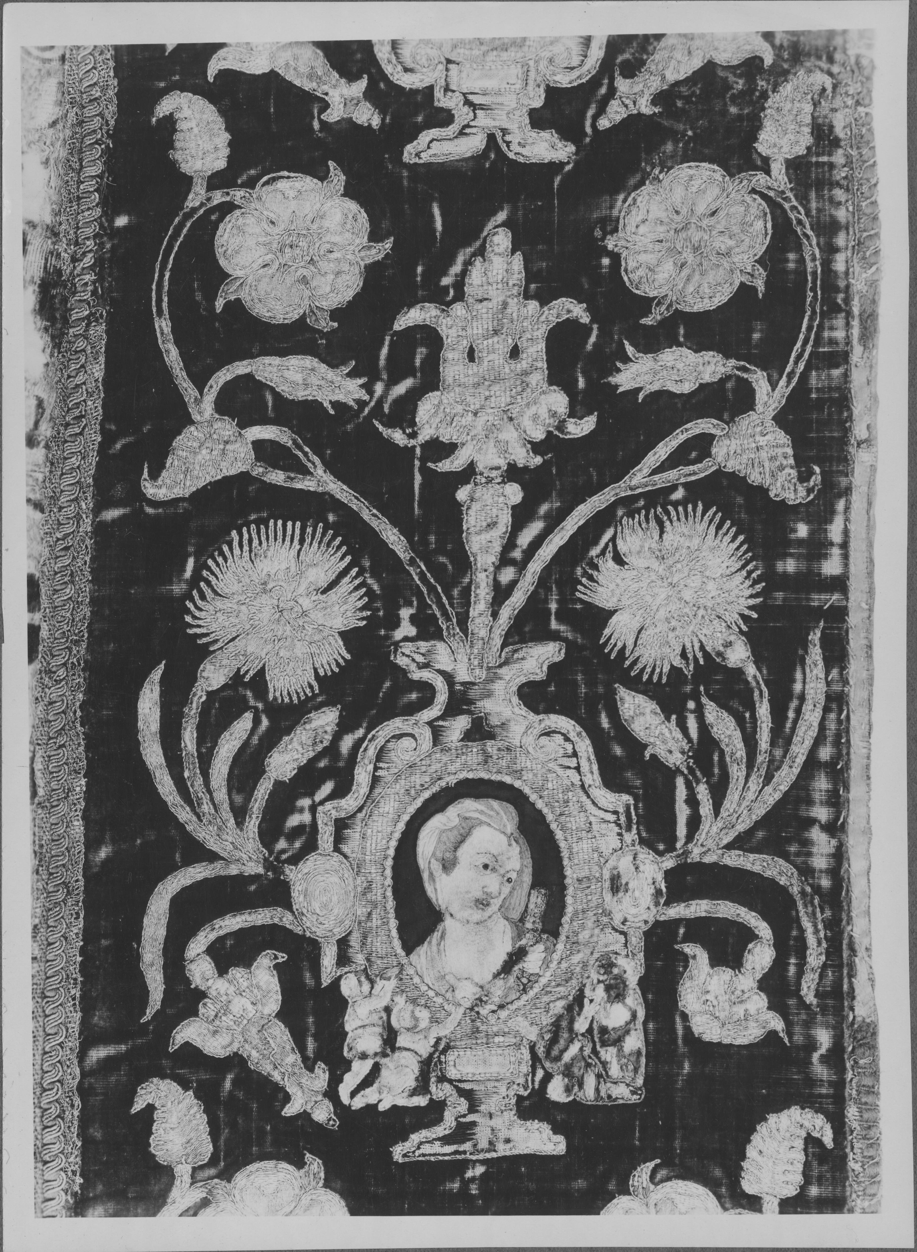 Beskrivning: Korkåpa av ljusblått damast, rikt fasonerat i rött och guldgult. Bred bård med applikationsbroderier i guld, silver och silke. Åtta medaljonger med kvinnoporträtt. På ryggskölden Marias kröning. Detalj. Textilutställning Stockholm 1929, nr 146.