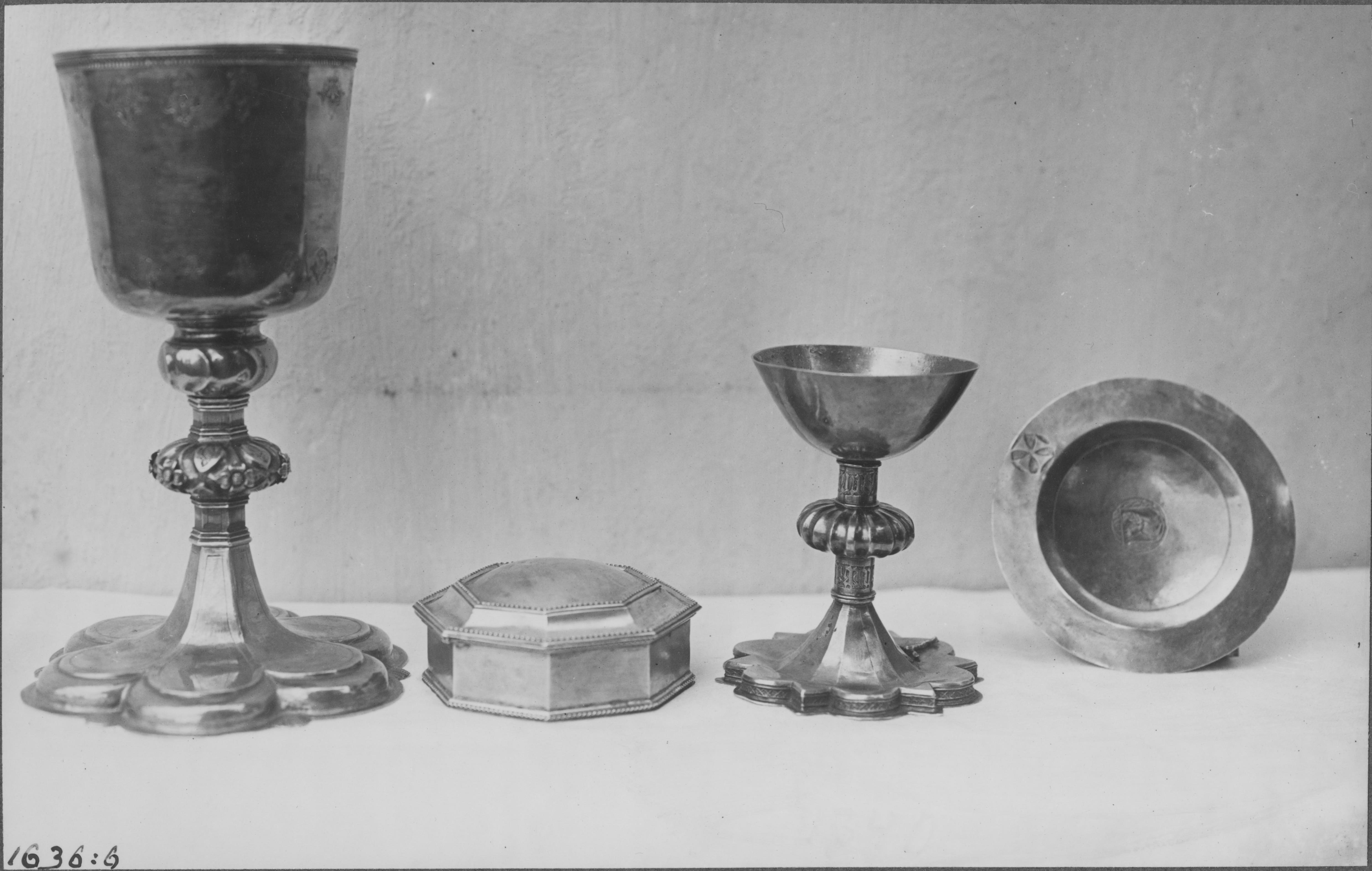Beskrivning: Kalk av silver, förgylld. Stämplad VL (Valentin Lennartsson. Mästare 1645-1668). Oblatask av silver. Lock med gångjärn och knäppe, pärlstavsornering. Kalk. Patén av silver, förgylld, 1600-talet. Snabbinventering.