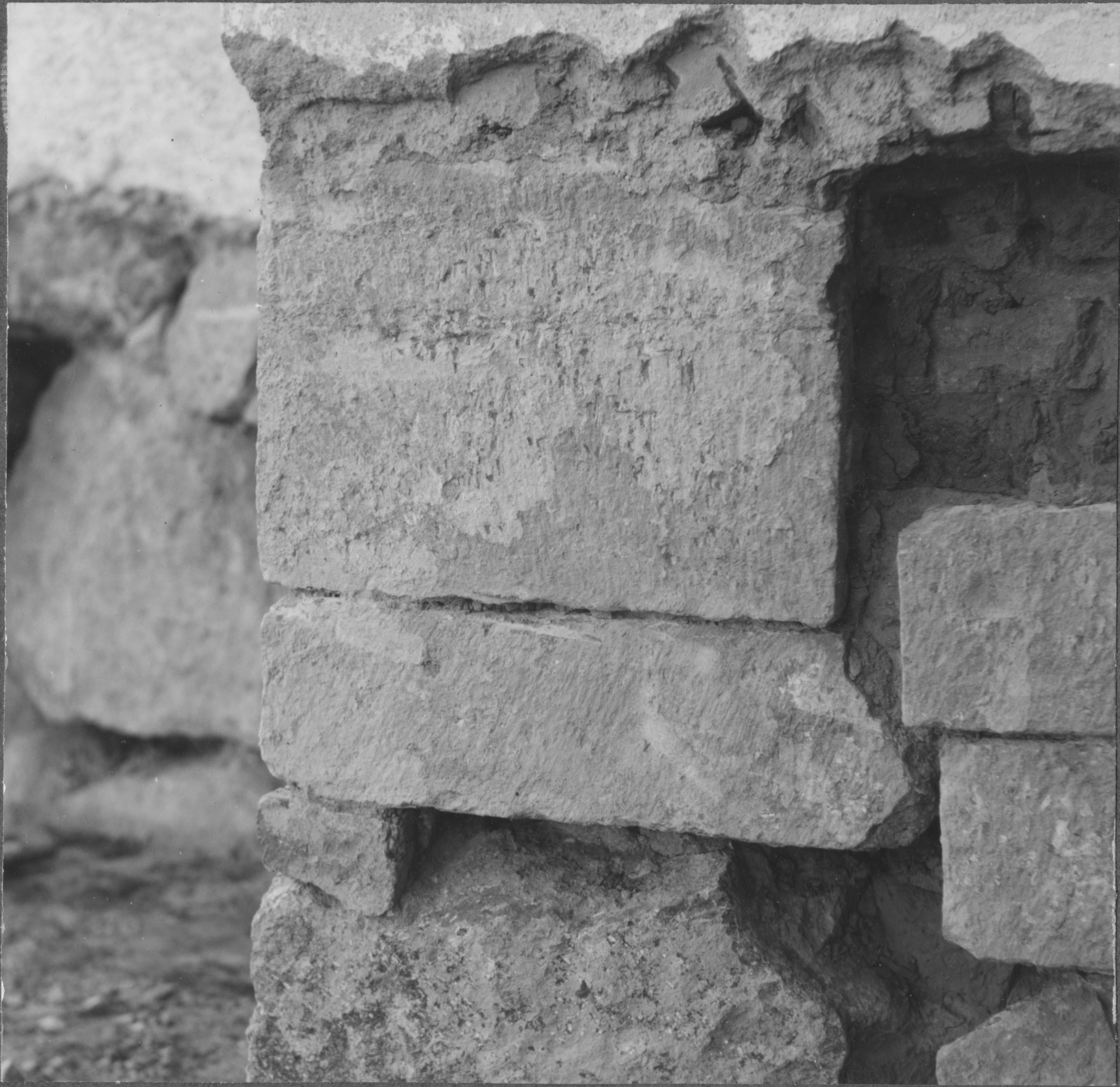 Beskrivning: Kalksten, medeltida huggen. Nordöstra hörnet av långhuset.