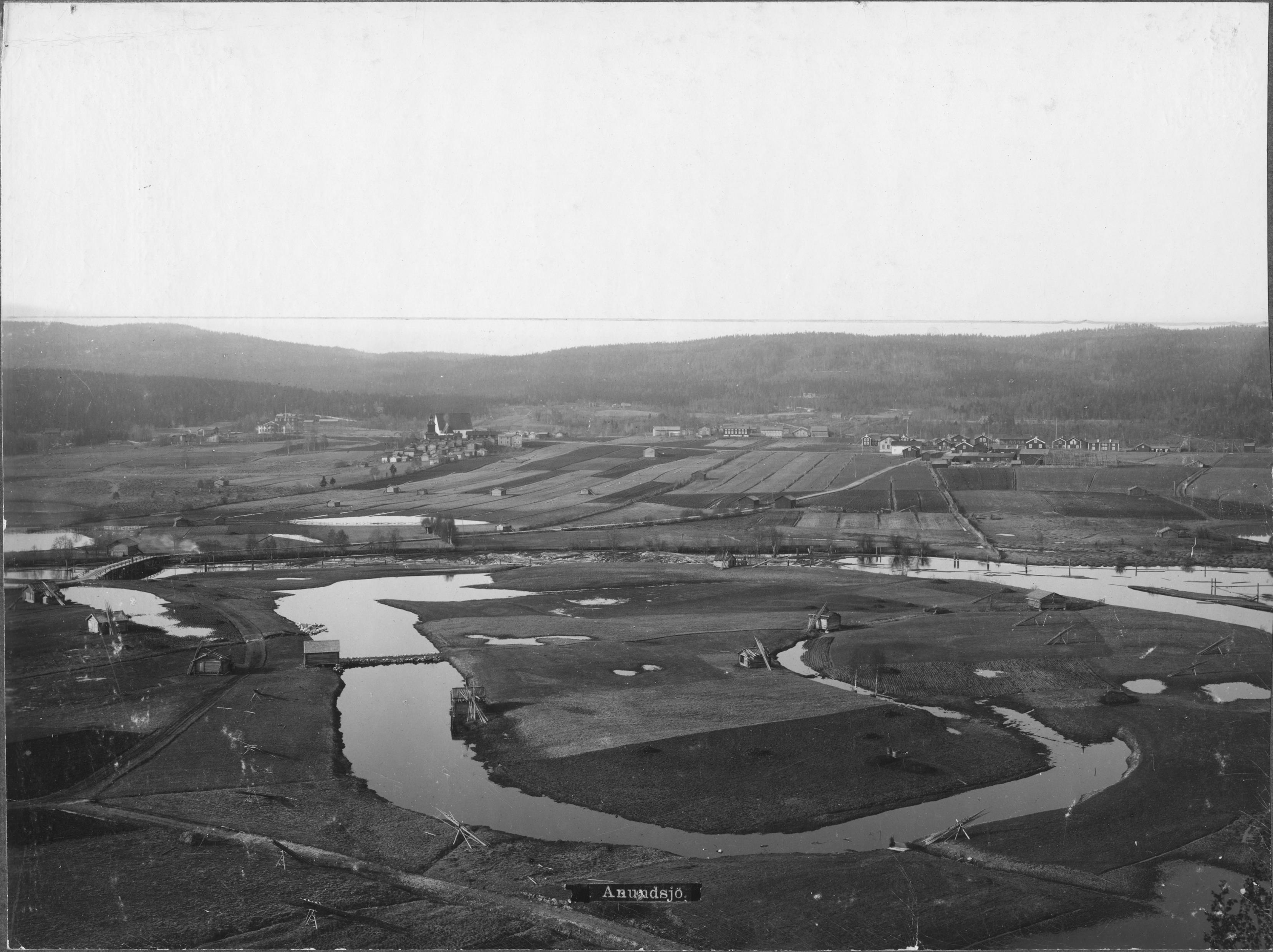 Beskrivning: Flygfoto. Bredbyn i Anundsjö. Foto för tidningen Hemmet, årgång 1898.