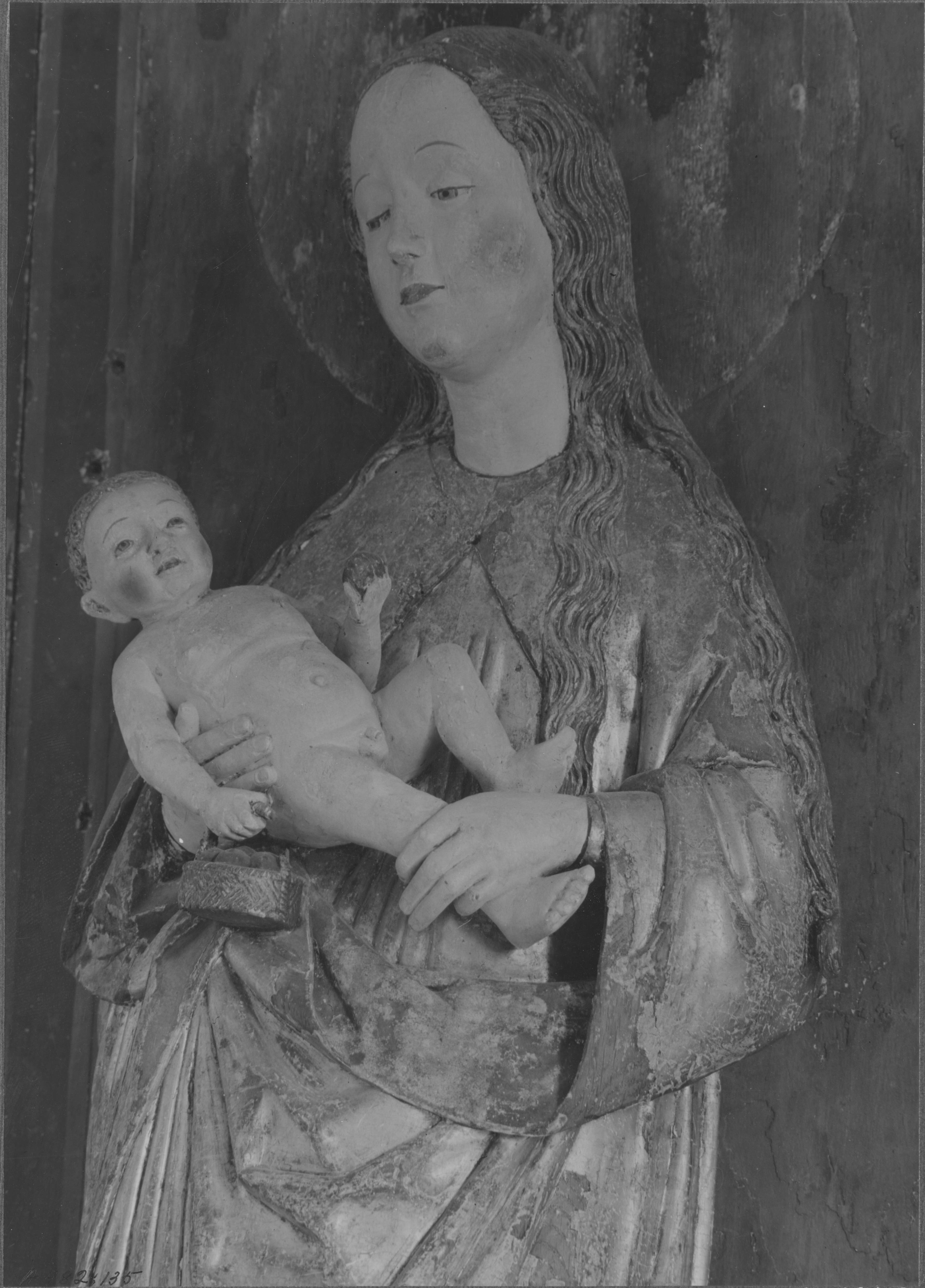 Beskrivning: Altarskåp, Mariaaltarskåp av trä. I corpus Madonnan, skulpterad, krederad och målad, hållande Jesusbarnet. Detalj. 1400-talets slut. Efter konservering 1945.