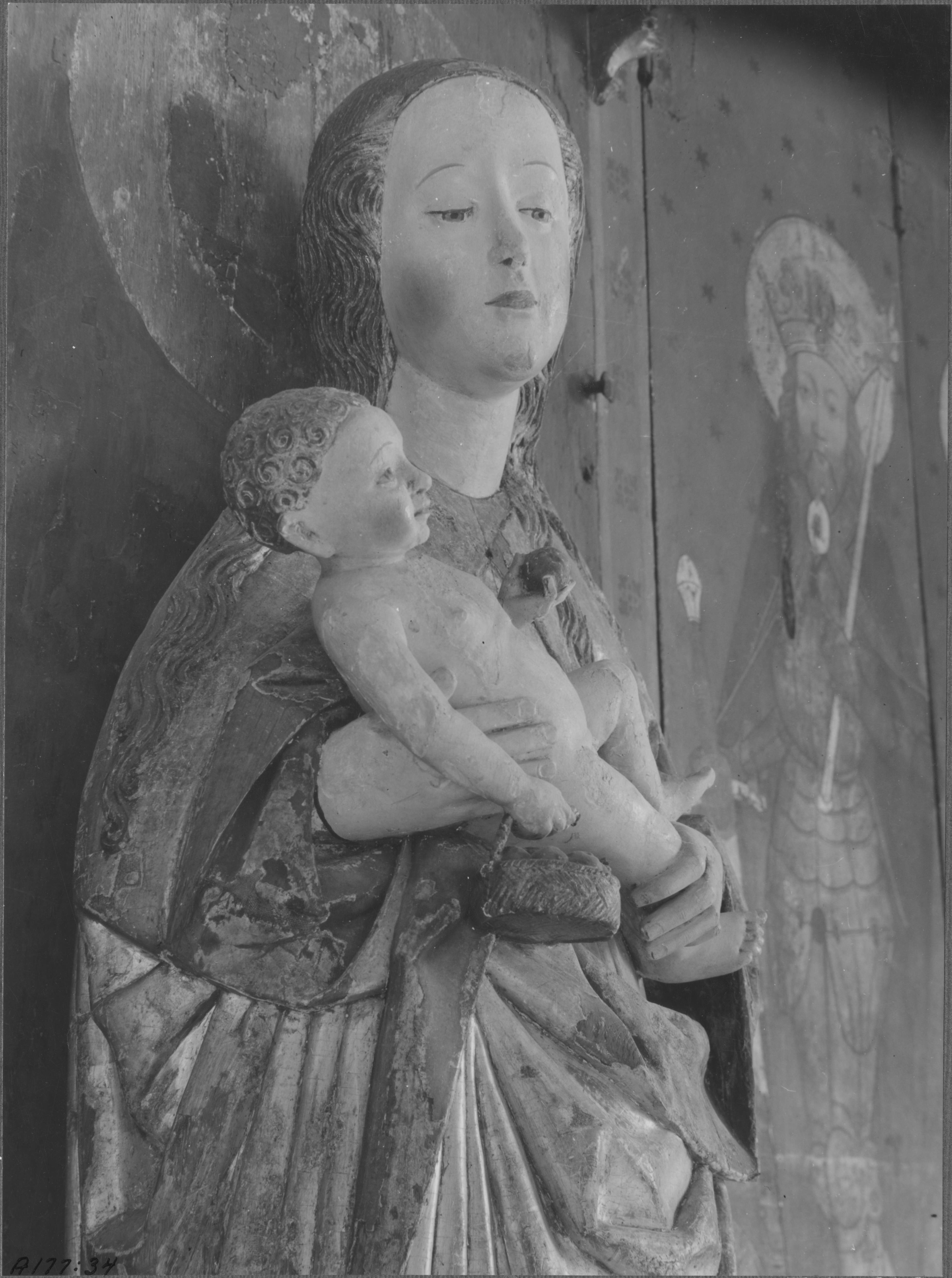 Beskrivning: Altarskåp, Mariaaltarskåp av trä. I corpus Madonnan, skulpterad, krederad och målad, hållande Jesusbarnet. Detalj. 1400-talets slut. Efter konservering 1945.