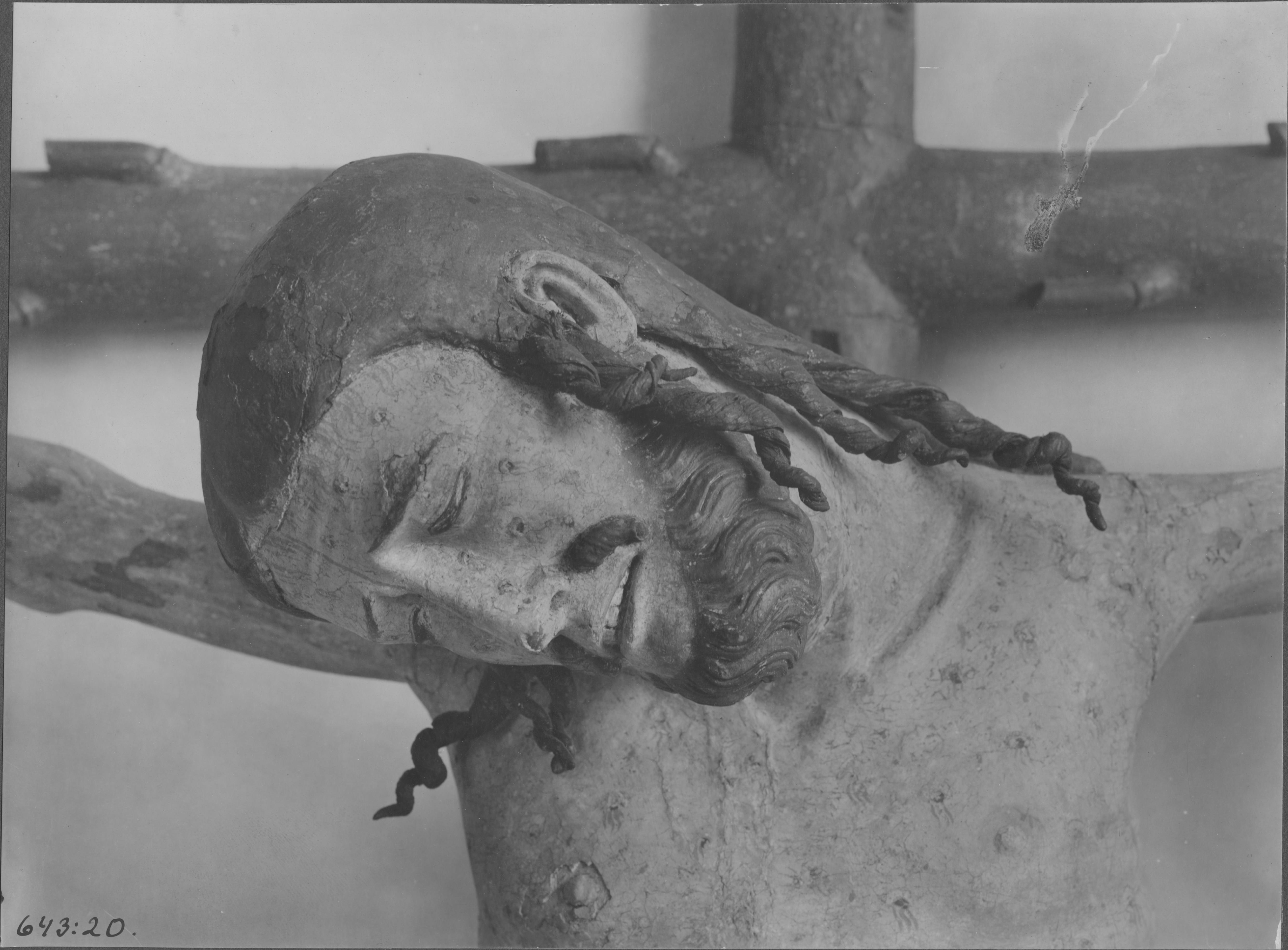 Beskrivning: Triumfkrucifix av trä, skulpterat och målat. Håret delvis av bast. Halvrunt kors. Detalj. 1300-talet. Konserverad 1925 av Alfred Nilsson.