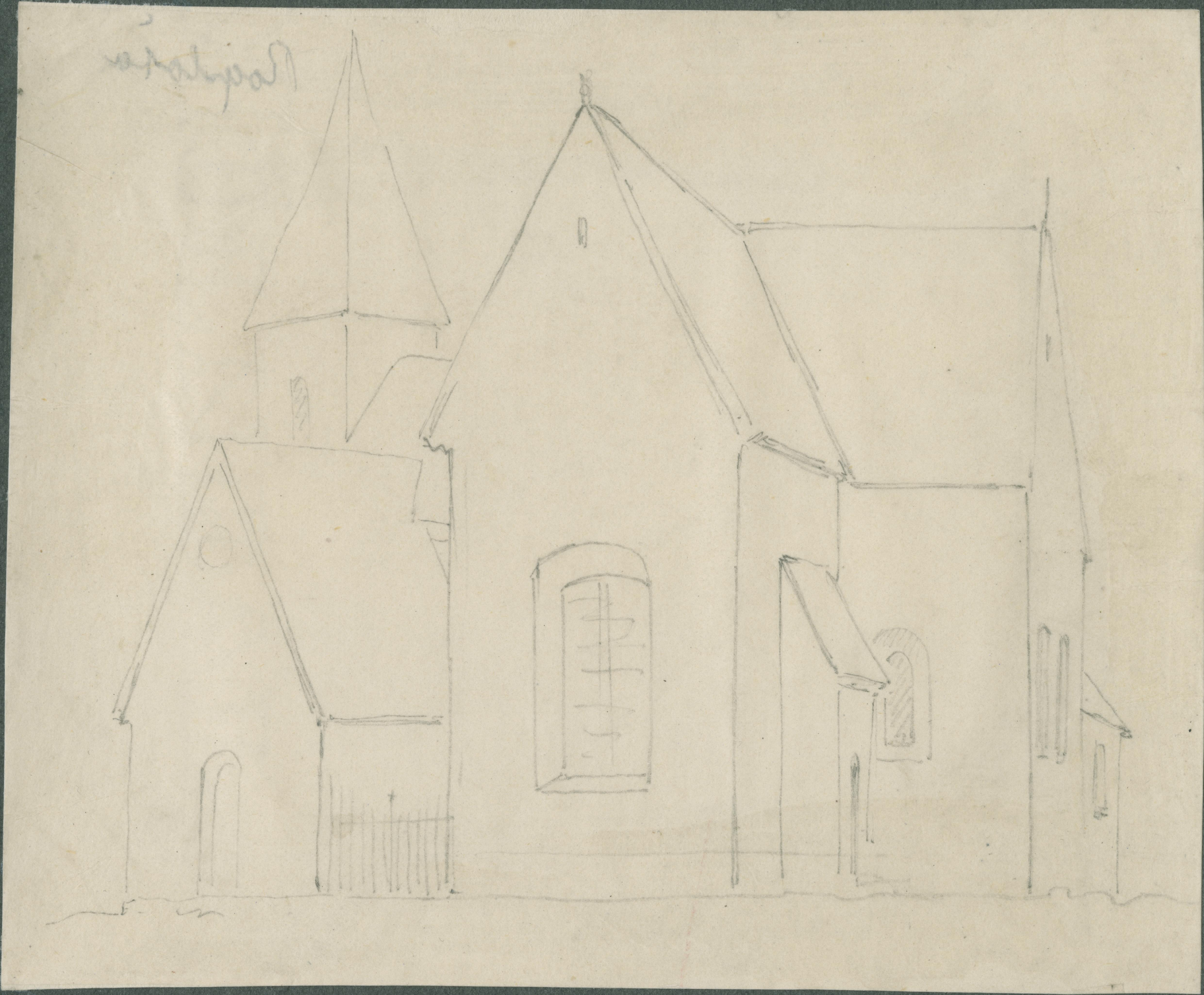 Beskrivning: Kyrkan från sydost. Teckning.
