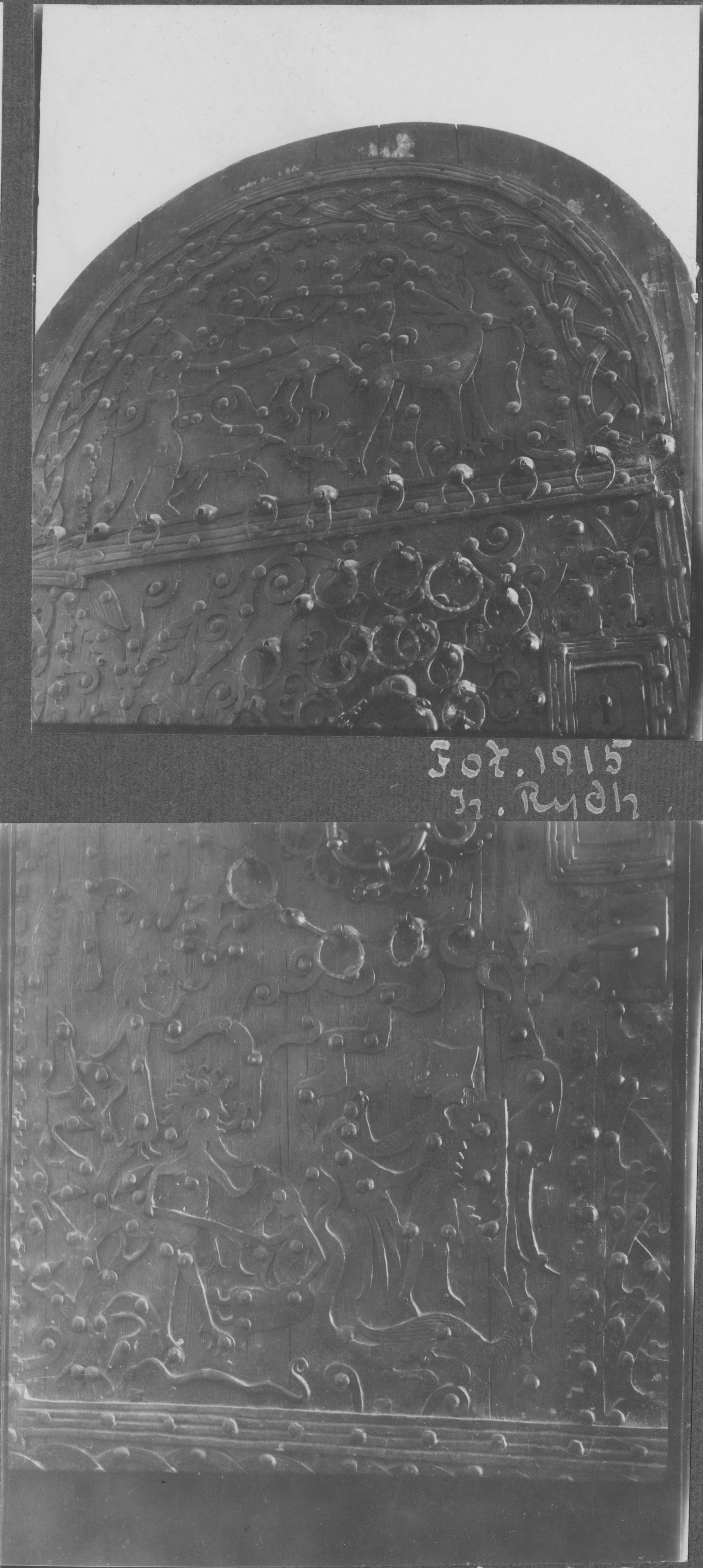 Beskrivning: Sydportalen, Rogslösadörren, en medeltida järnbeslagen trädörr med figurframställningar. Dendrodaterad till 1275. Kyrkans huvudingång.