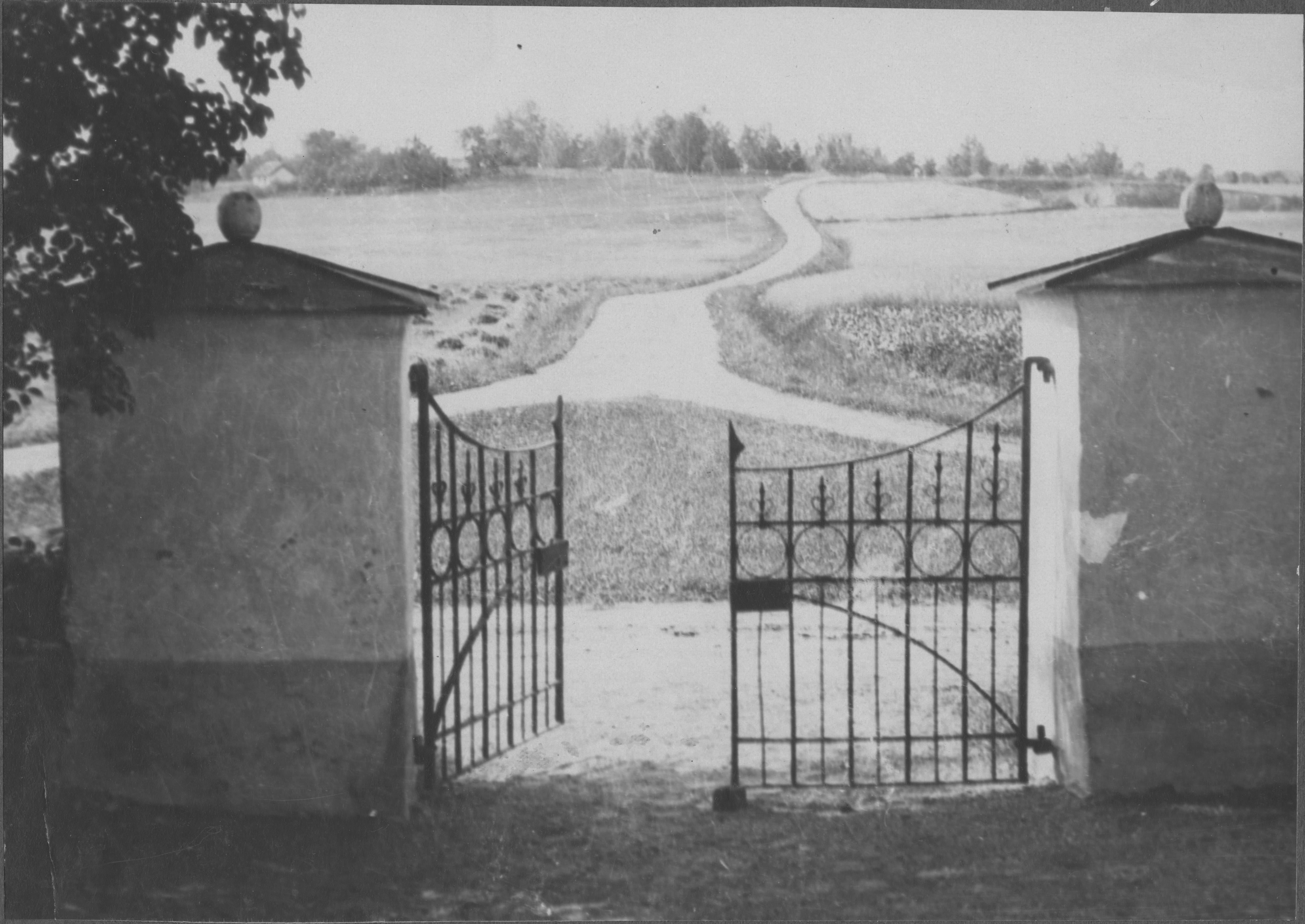Beskrivning: Grindstolpar med smidda svartmålade grindar.