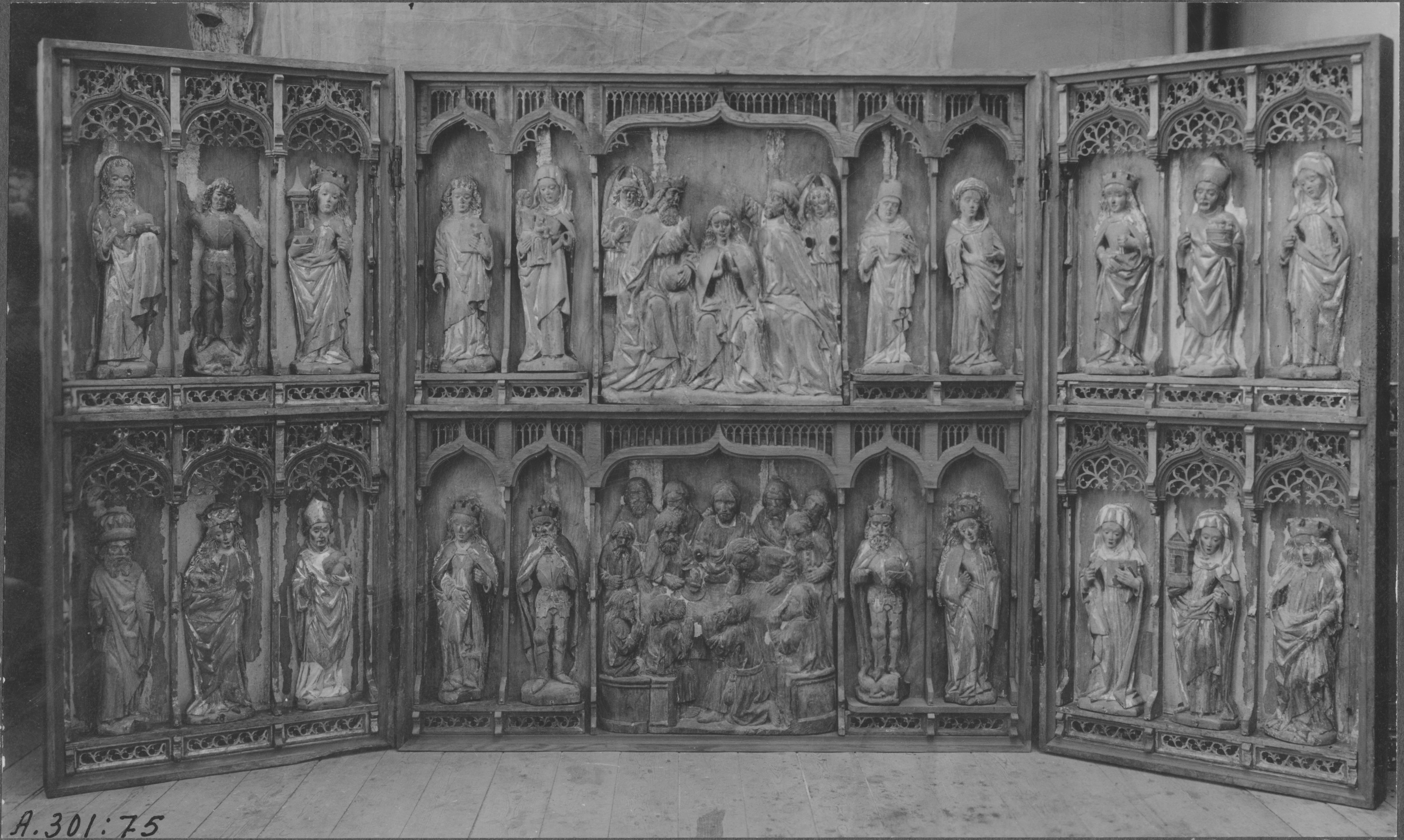 Beskrivning: Altarskåp med skulpterade figurer i corpus och flyglarna. I corpus Marias kröning och nattvarden samt helgon. I flyglarna helgon. Defekt i corpus och högra flygeln. 1400-talets slut. Efter konservering 1936.