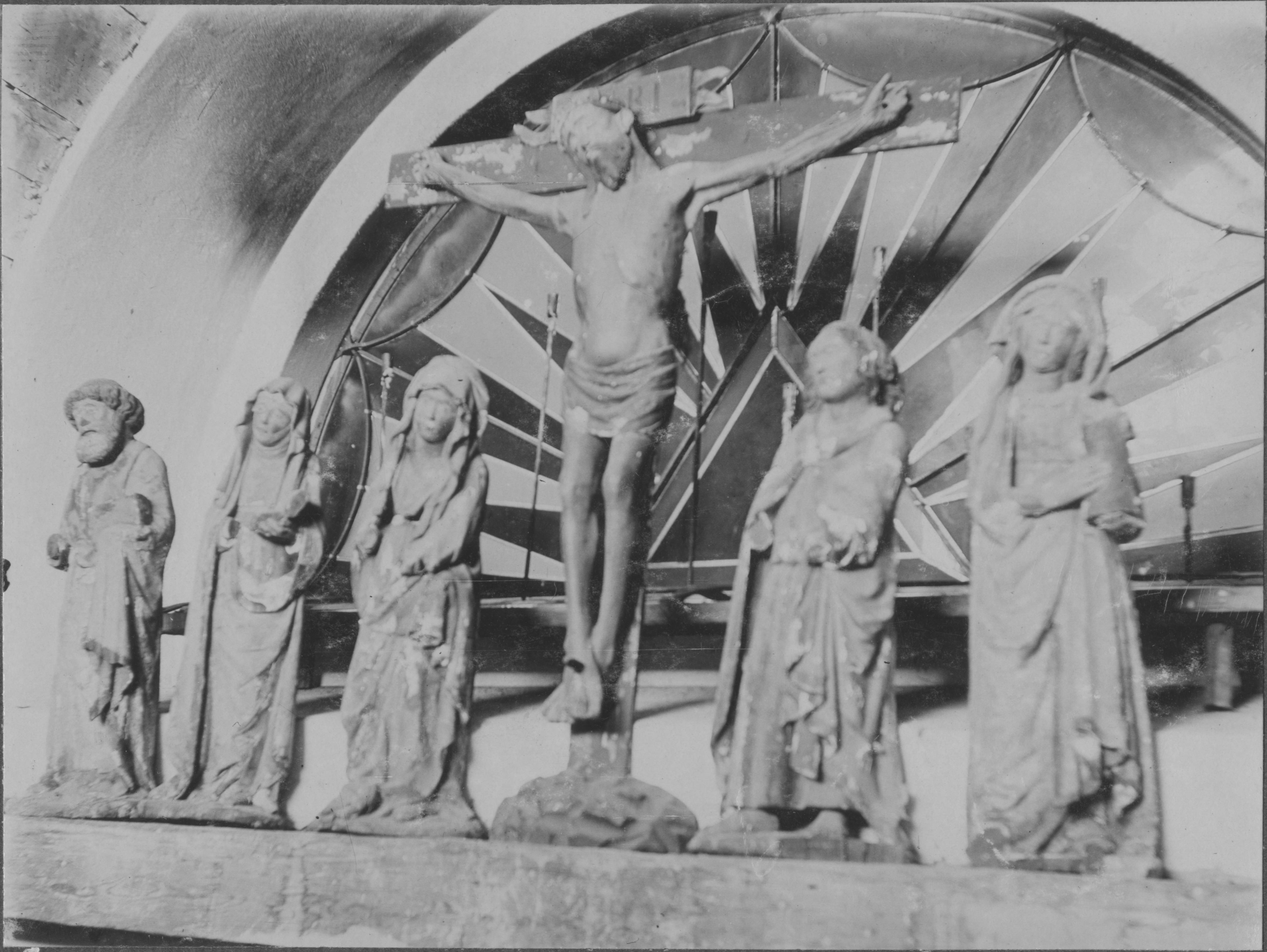 Beskrivning: Träskulptur i ek föreställande apostel med skägg. Höger arm avslagen. Träskulptur i ek föreställande Birgitta. I vänstra handen en uppslagen bok, högra handen bortslagen. Träskulptur i ek föreställande Maria. Underarmarna avslagna. Krucifix i ek. Träskulptur i snidad ek, föreställande Maria Magdalena hållande smörjelsekar. Har tillhört litet altarskåp, sannolikt nordtyskt arbete från 1475-1500.