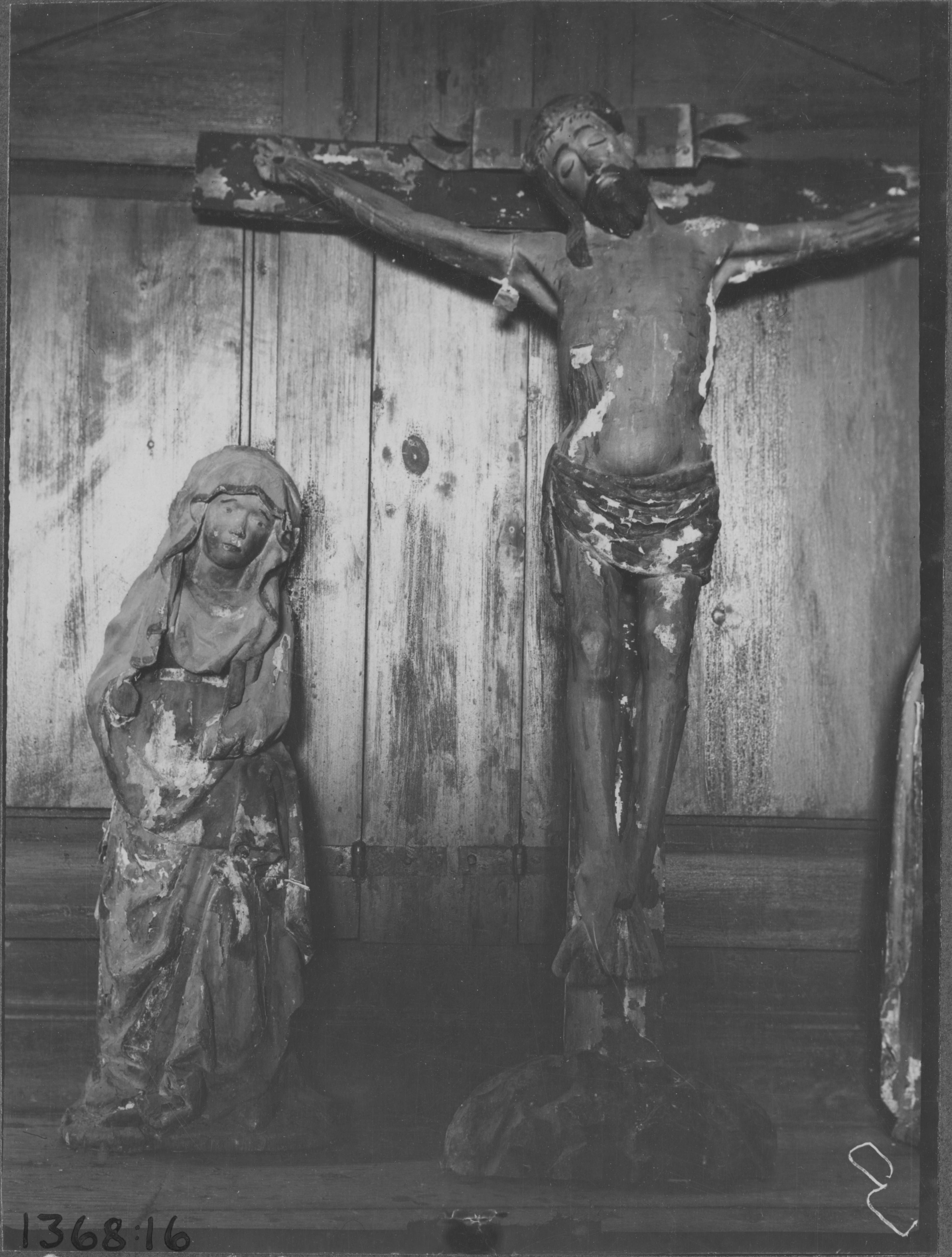 Beskrivning: Träskulptur i ek föreställande Maria. Underarmarna avslagna. Krucifix i ek. Har tillhört litet altarskåp, sannolikt nordtyskt arbete från 1475-1500. Snabbinventerng.
