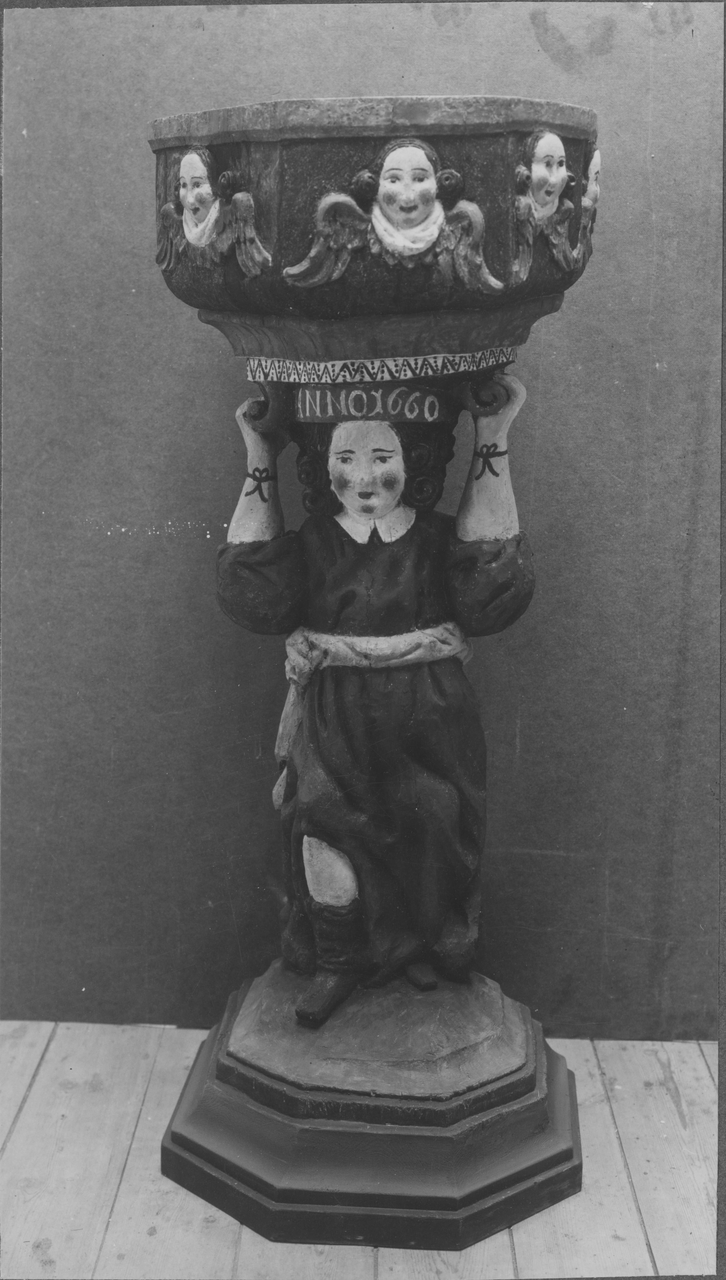 Beskrivning: Dopfunt av trä. Änglar på cuppan som bärs upp av en mansfigur. Tillverkad 1688 i Wernerska verkstaden i Östra Tollstad. Efter restaurering 1937.