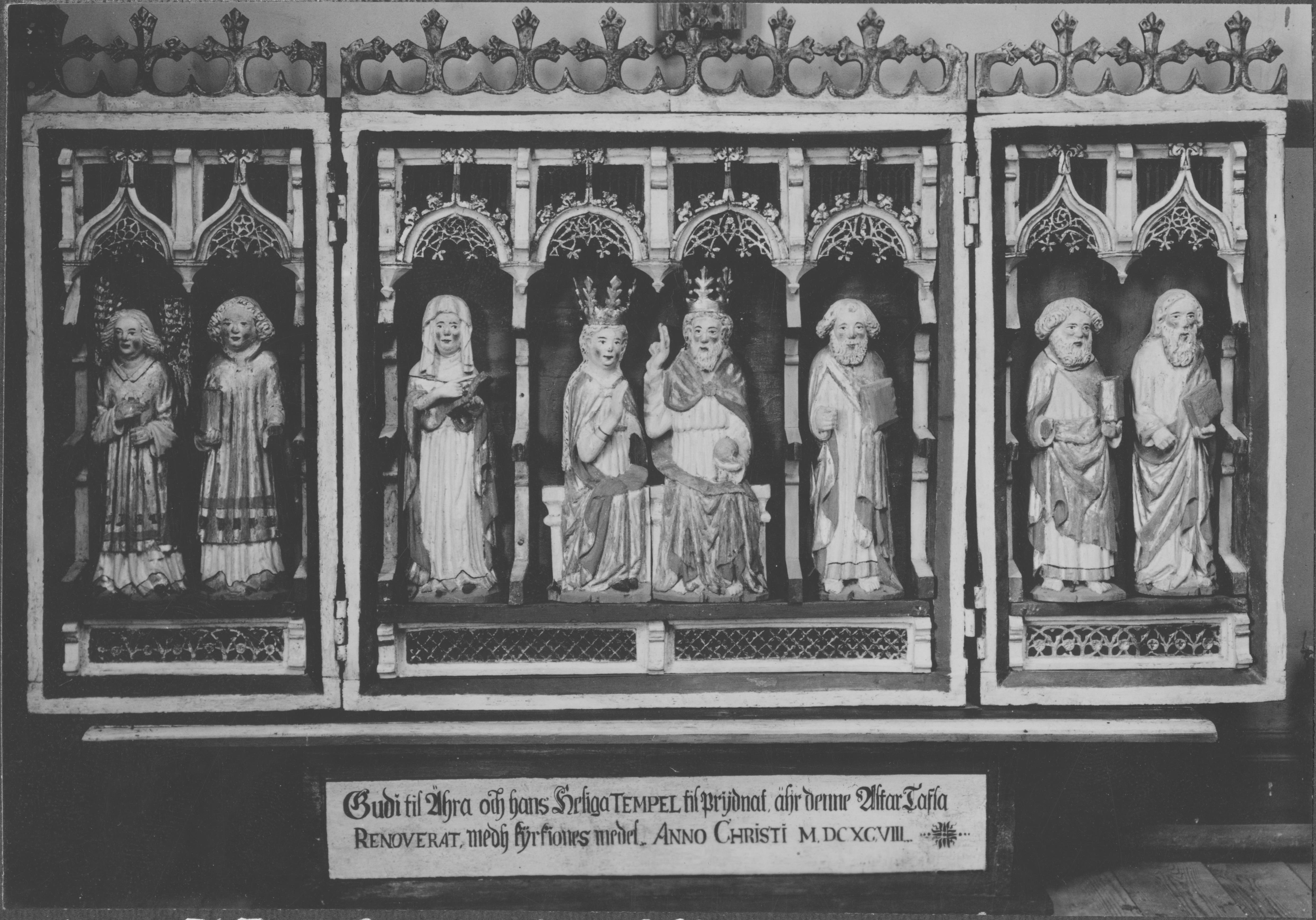 Beskrivning: Altarskåp av trä med två flygeldörrar. Snidade, krederade och målade figurer, två i varje dörr, fyra i corpus. Svenskt eller nordtyskt arbete från omkring 1500. Efter konservering 1937.