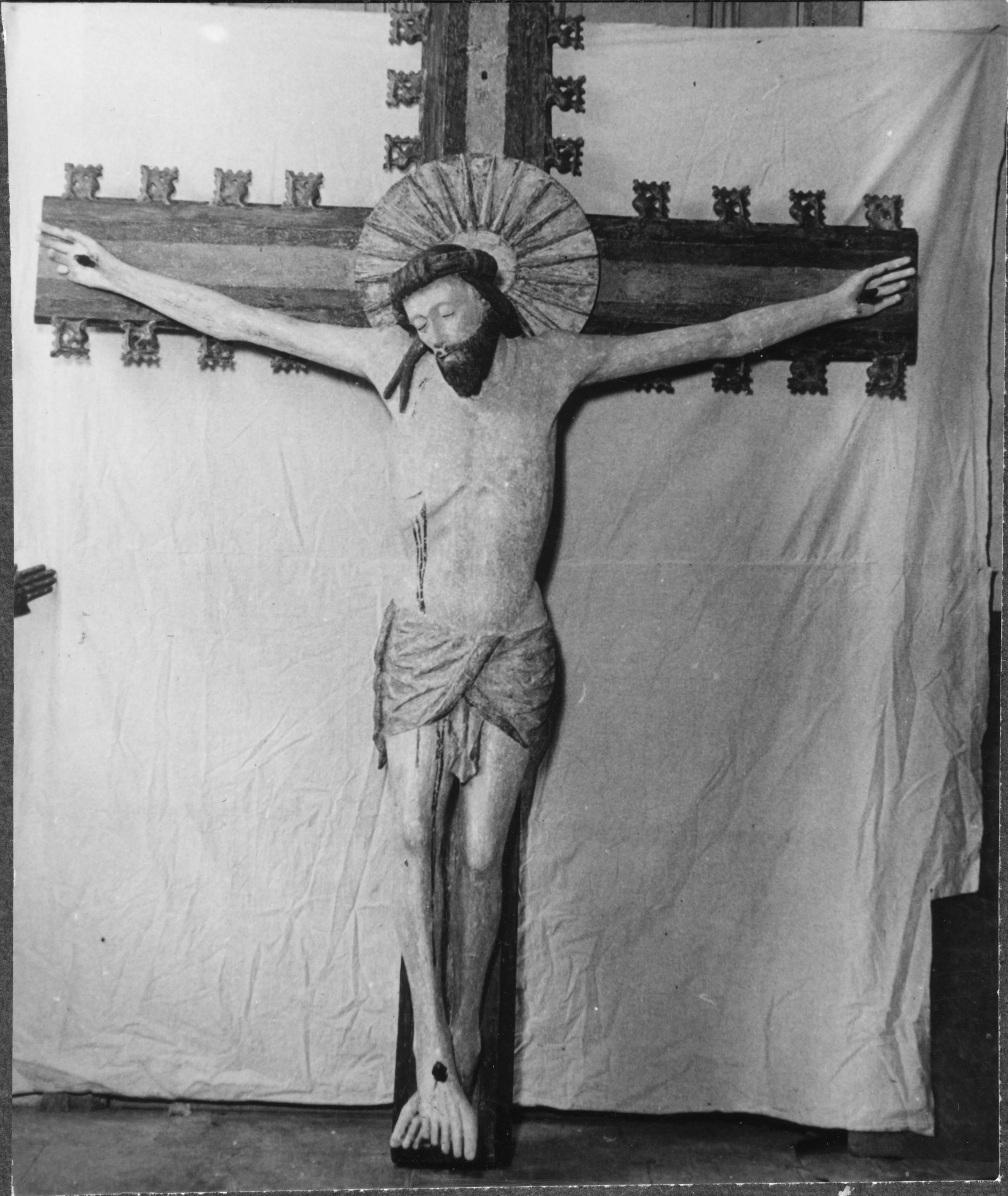 Beskrivning: Triumfkrucifix, träskulptur. Korsets tre övre armar har gotiska blad vid kanterna. Omkring 1500 (snabbinv). Efter restaurering.
