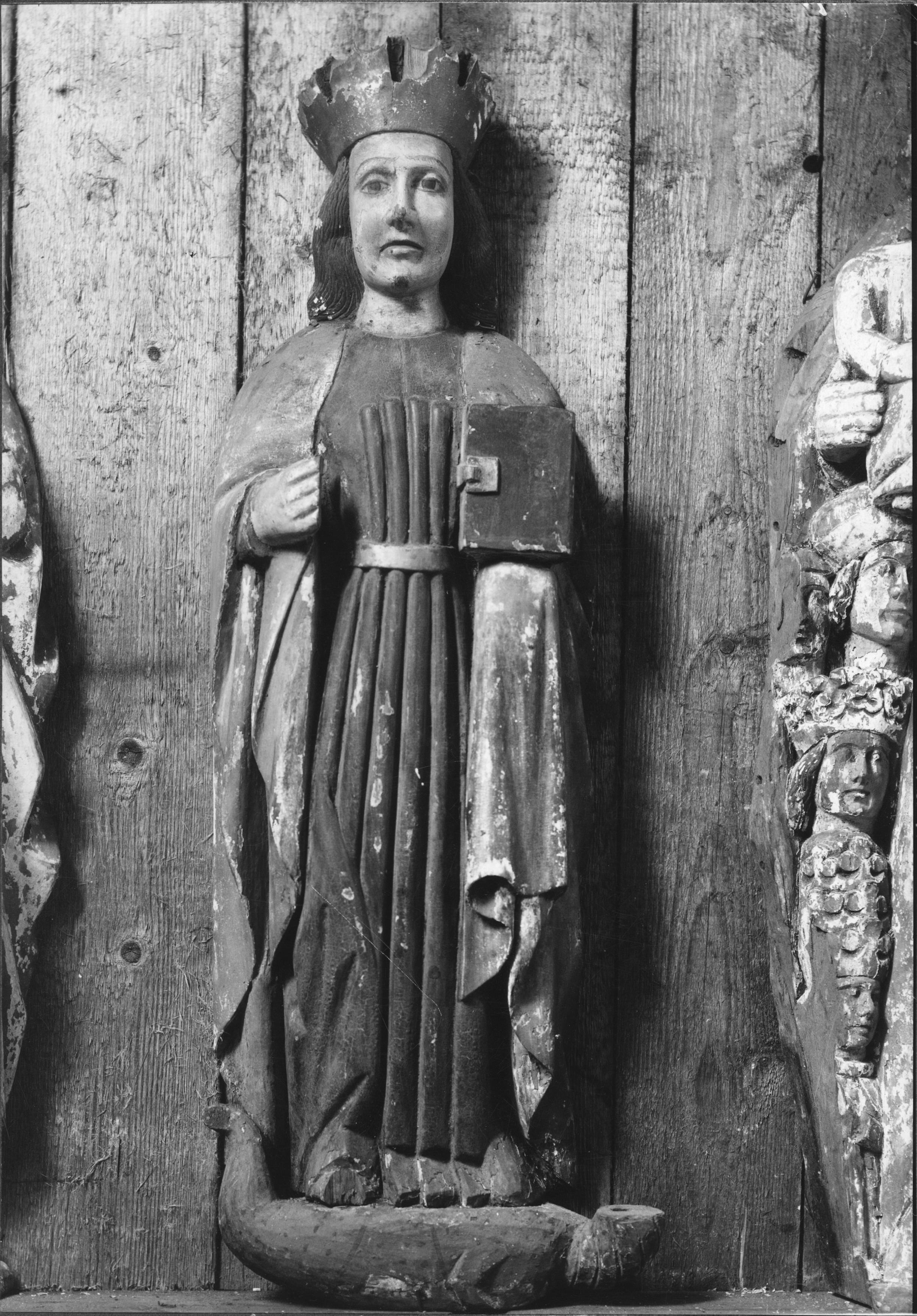 Beskrivning: Träskulptur. Apostel? Ur ett altarskåp. Omkring 1500 (snabbinv).