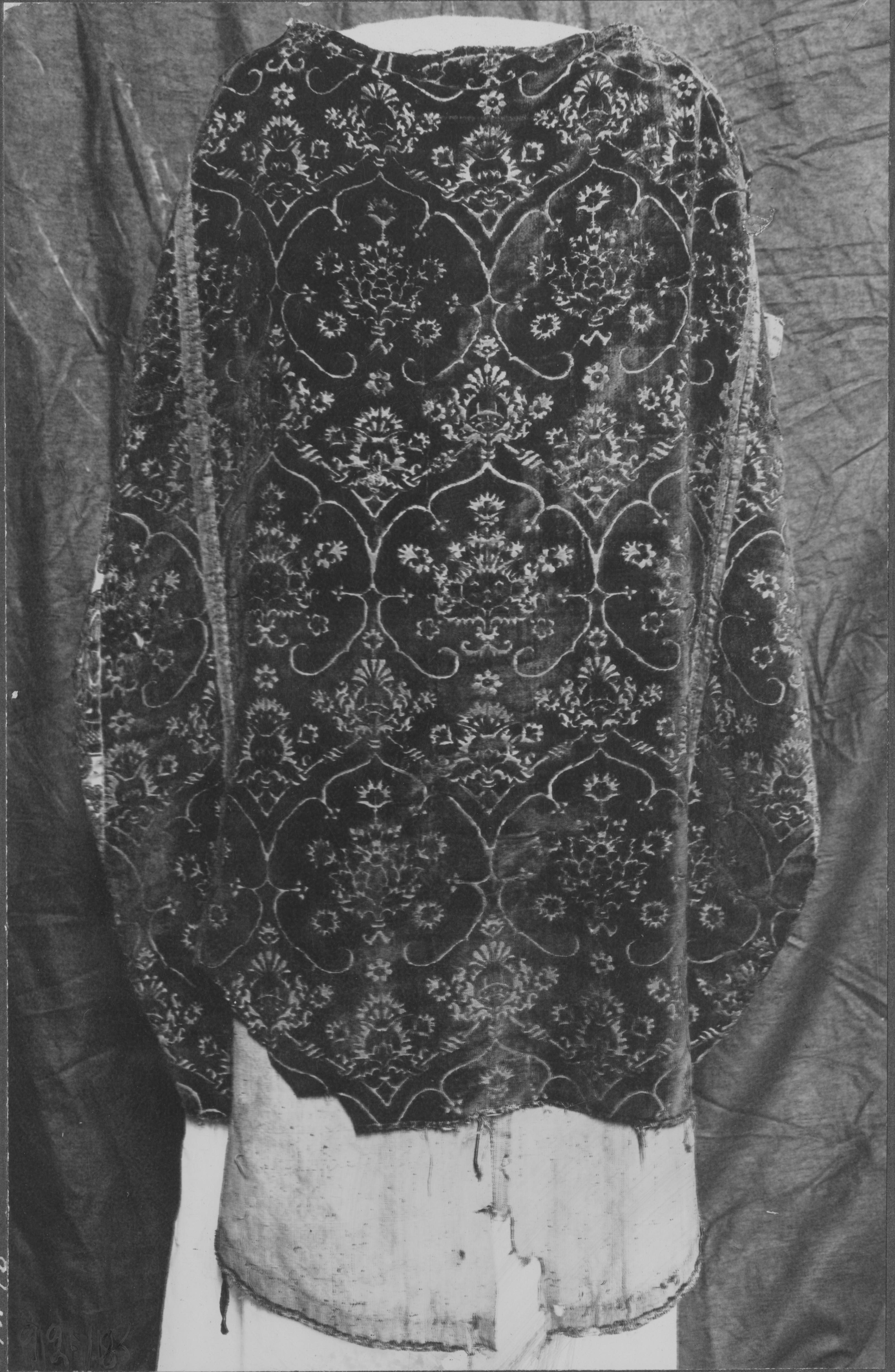 Beskrivning: Mässhake av mönstrad purpurröd sammet. Har tjänstgjort som foder till tidigare nämnd mässhake.