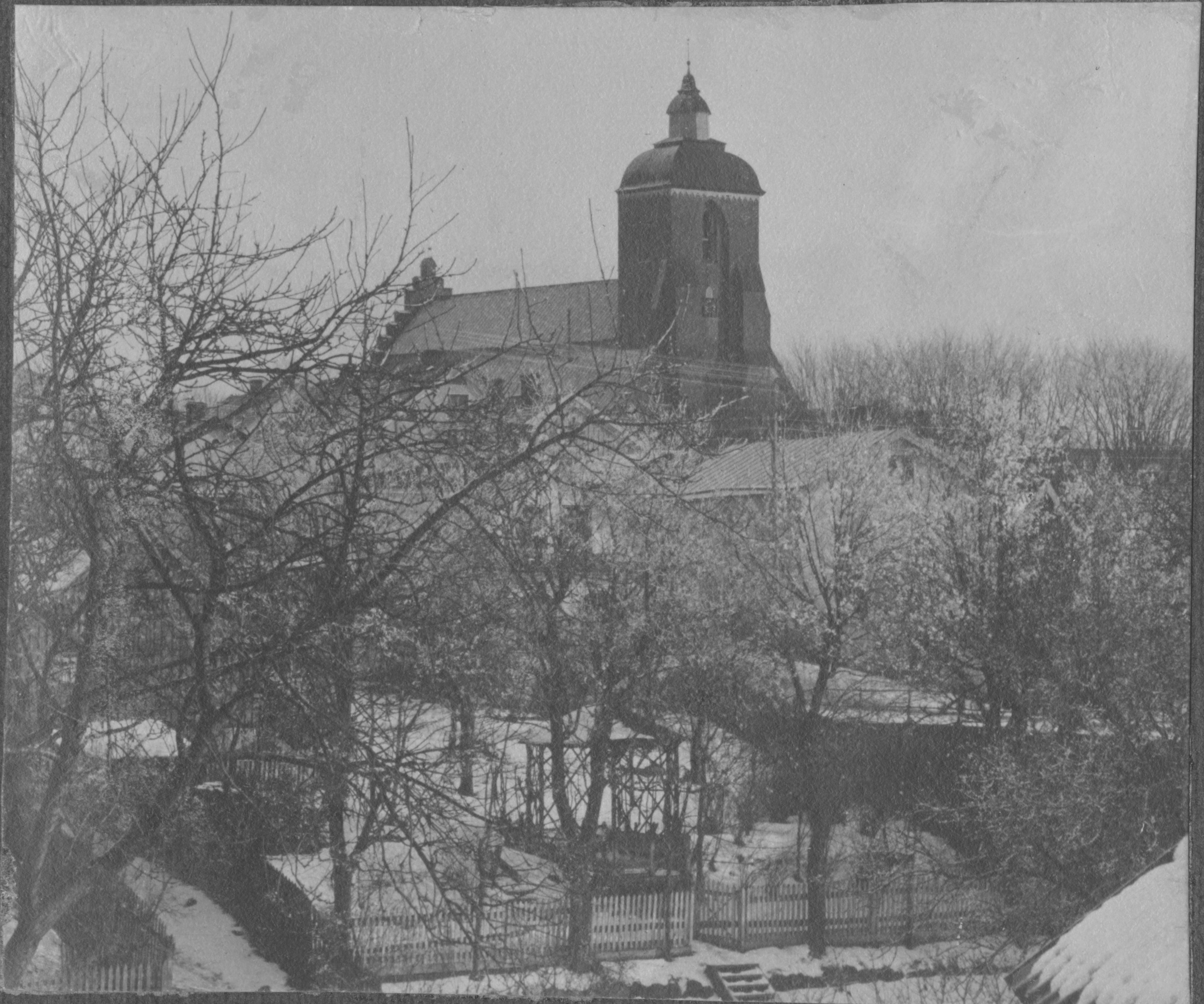 Beskrivning: Kyrkan med omnejd. Från nordväst.