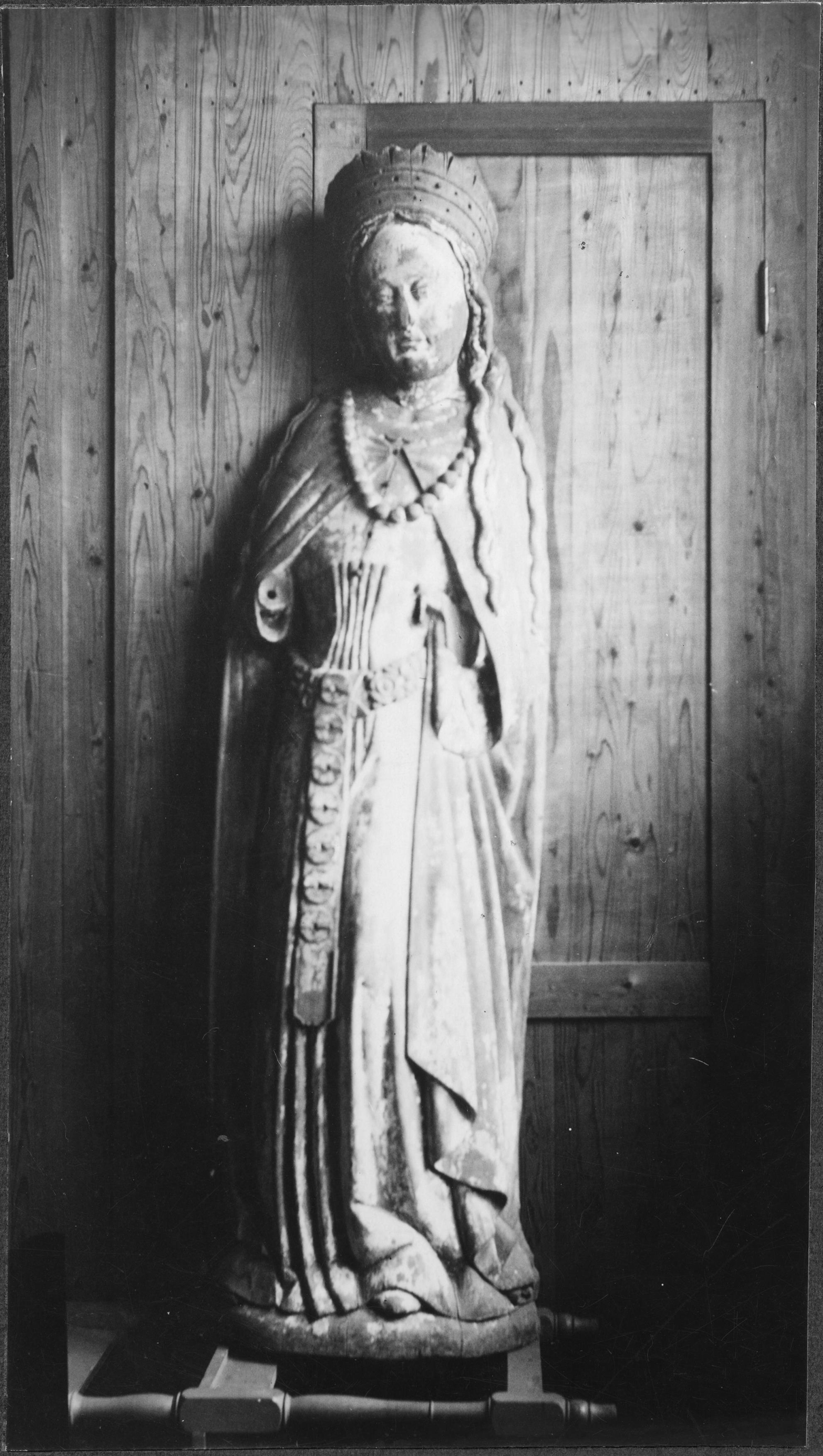 Beskrivning: Träskulptur, madonna. Veckad dräkt, bälte med nedhängande band med besättning. Armar och barnet borta. 1500-talets början, snabbinv.