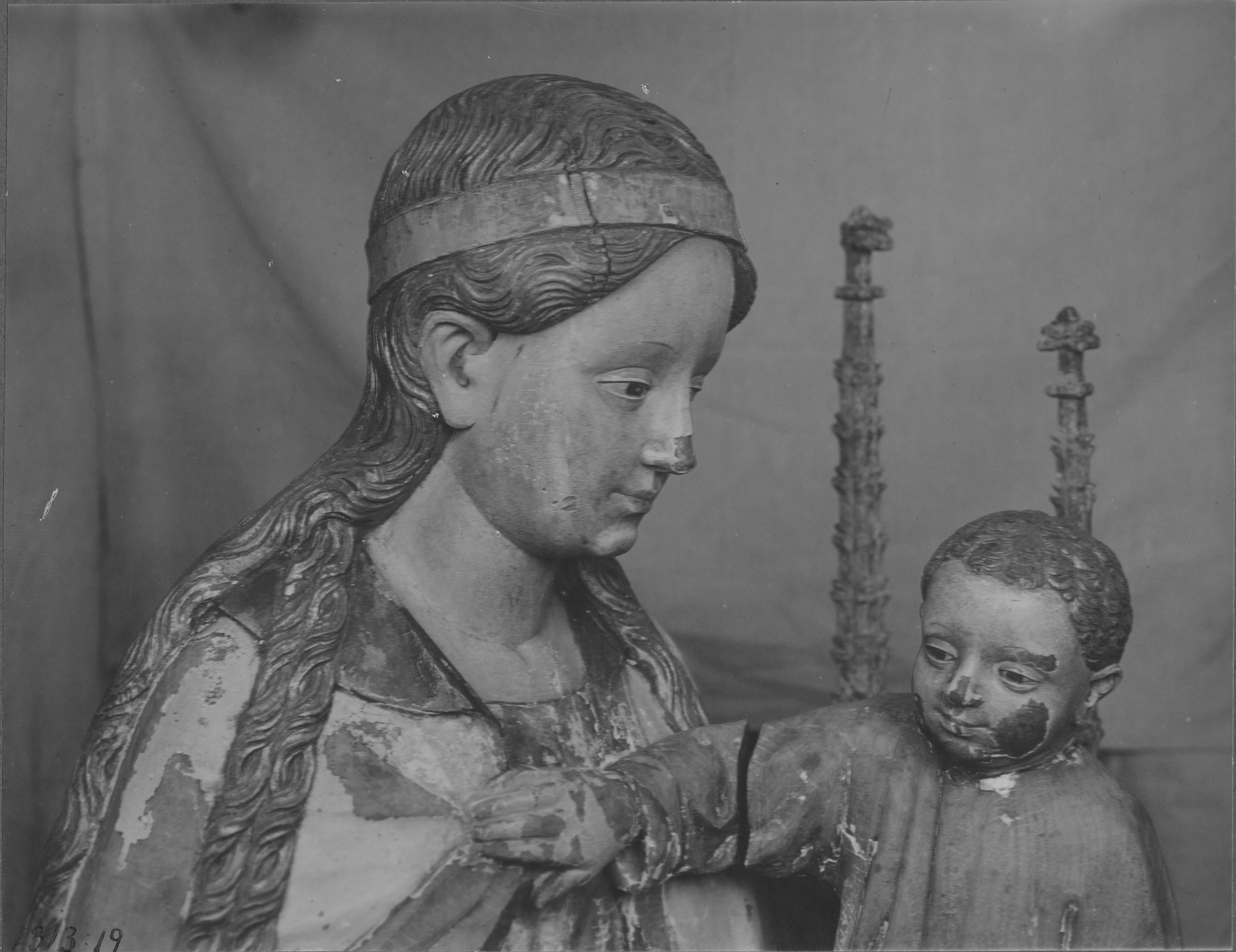 Beskrivning: Träskulptur av ek föreställande madonna med barnet. Marias högra och barnets vänstra hand bortfallna, skåpet har förlorat underrede och flygeldörrar. Betydande färgfragment bevarade, ansiktena väl restaurerade. Detalj. Senmedeltid.