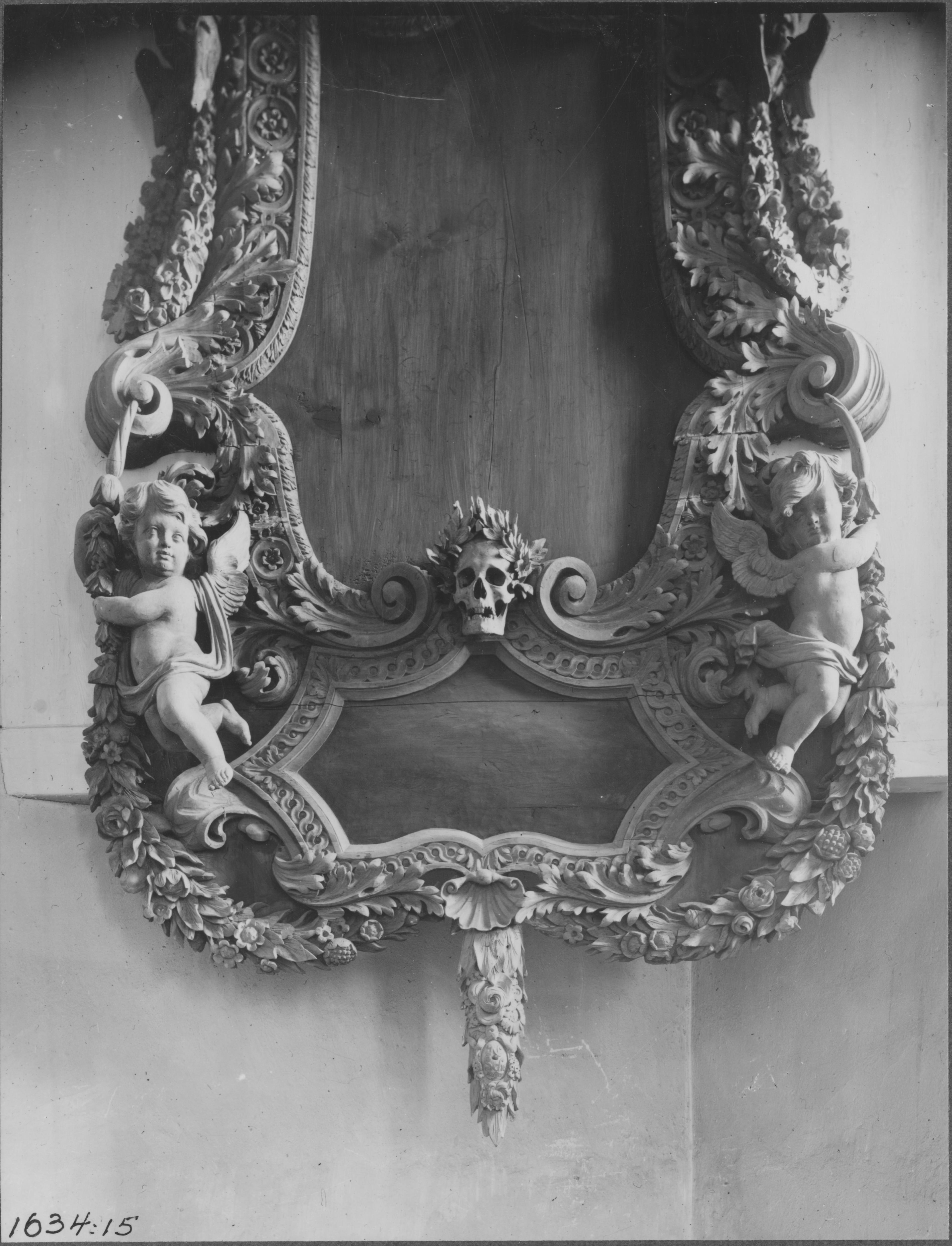 Beskrivning: Epitafium av snidat trä, omålat, ofullbordat. Sköldformigt mittfält ett mindre fält nedtill. Som krön en Justitia i friskulptur. Detalj. Omkring 1700. Snabbinventering.