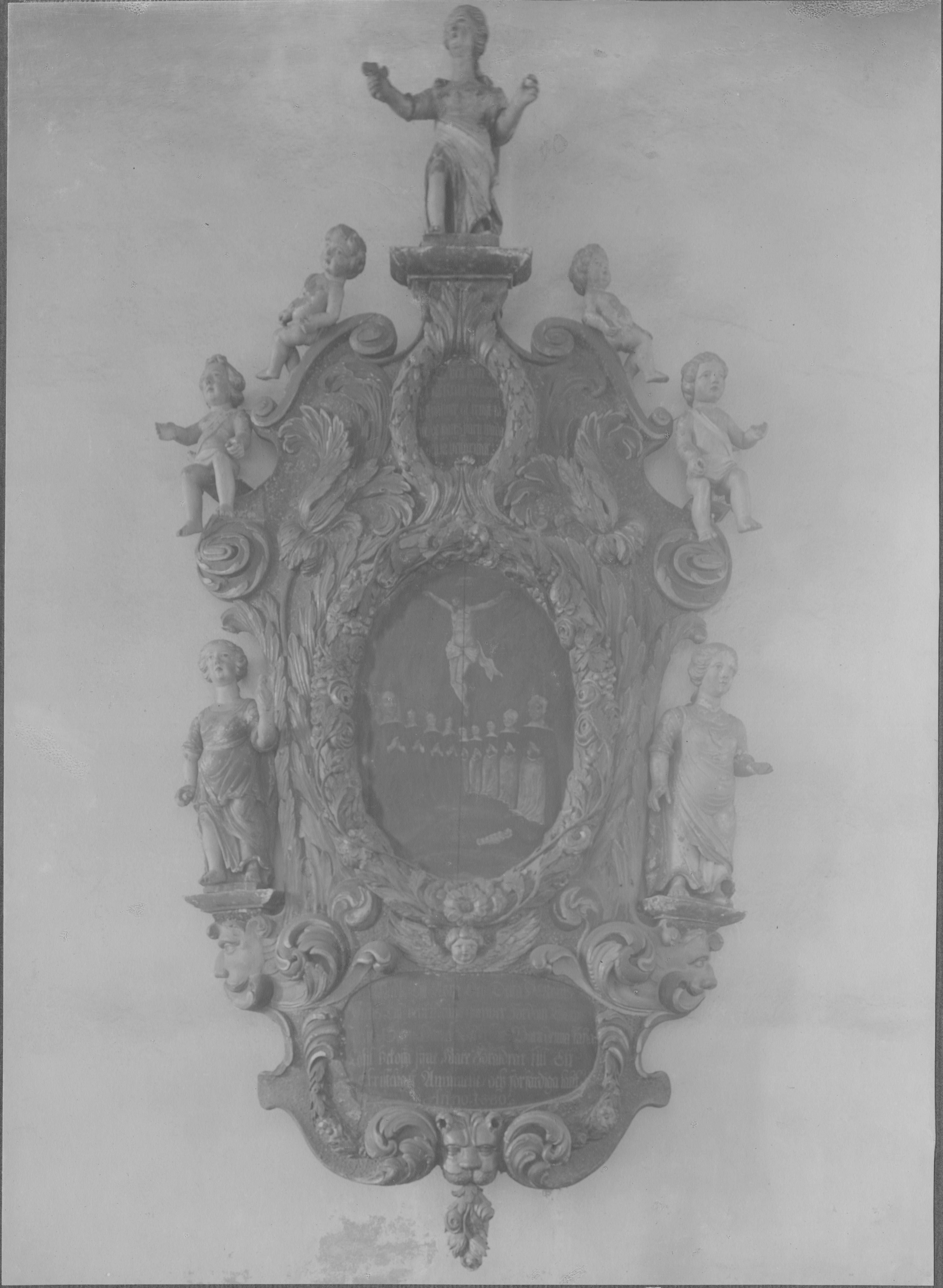 Beskrivning: Epitafium över borgmästaren Daniel Pederson, 1680. Snidat och målat trä med oval mittavla med en knäböjande familj vid krucifixet. Upptill och nedtill ovala kartuscher, den nedre med inskrift.