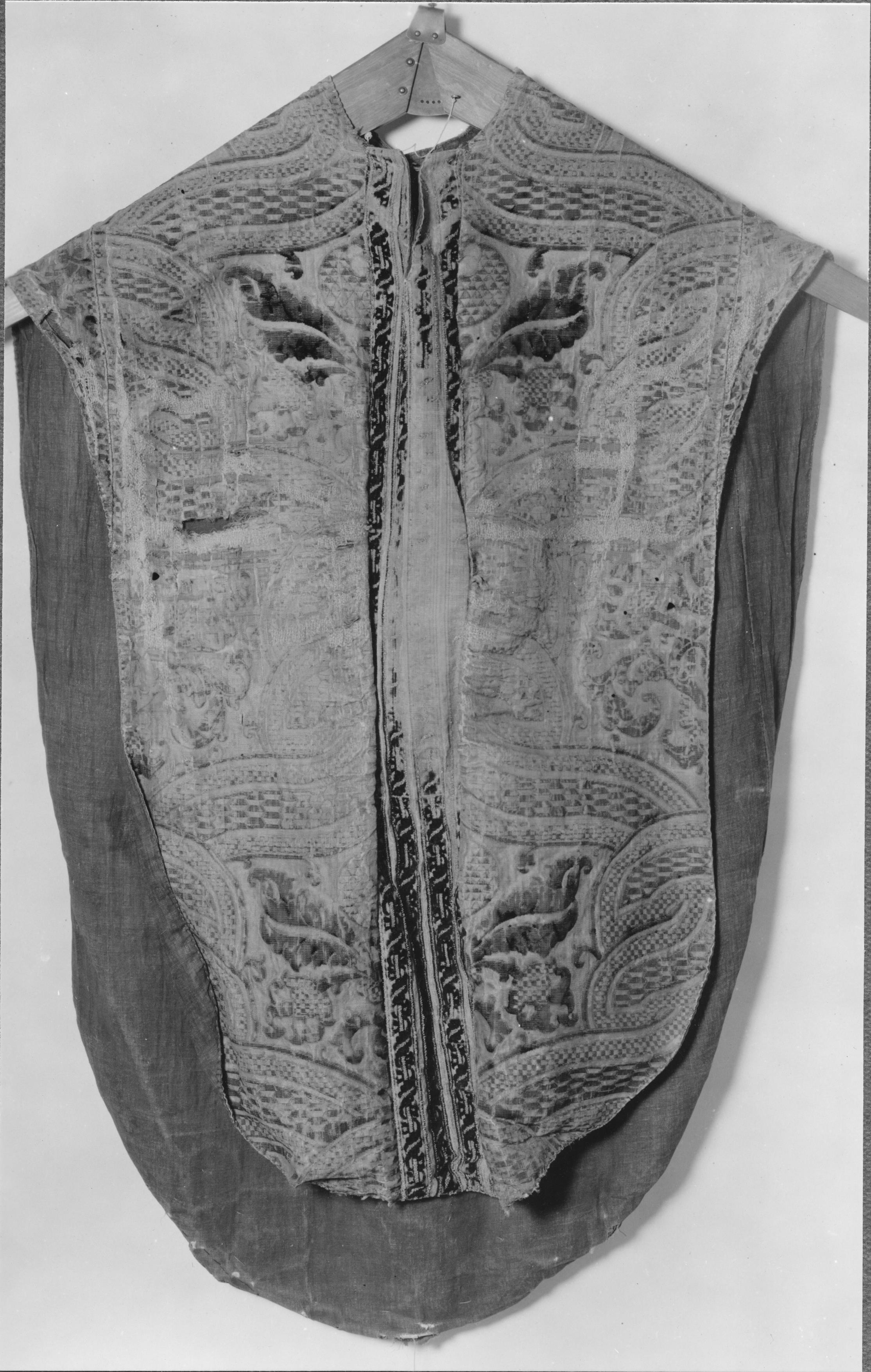 Beskrivning: Mässhake av stormönstrad sammet med guldinslag, fodrad med brun lärft. Bröststycket med smalare guldband med bårder än ryggstycket. Före konservering.