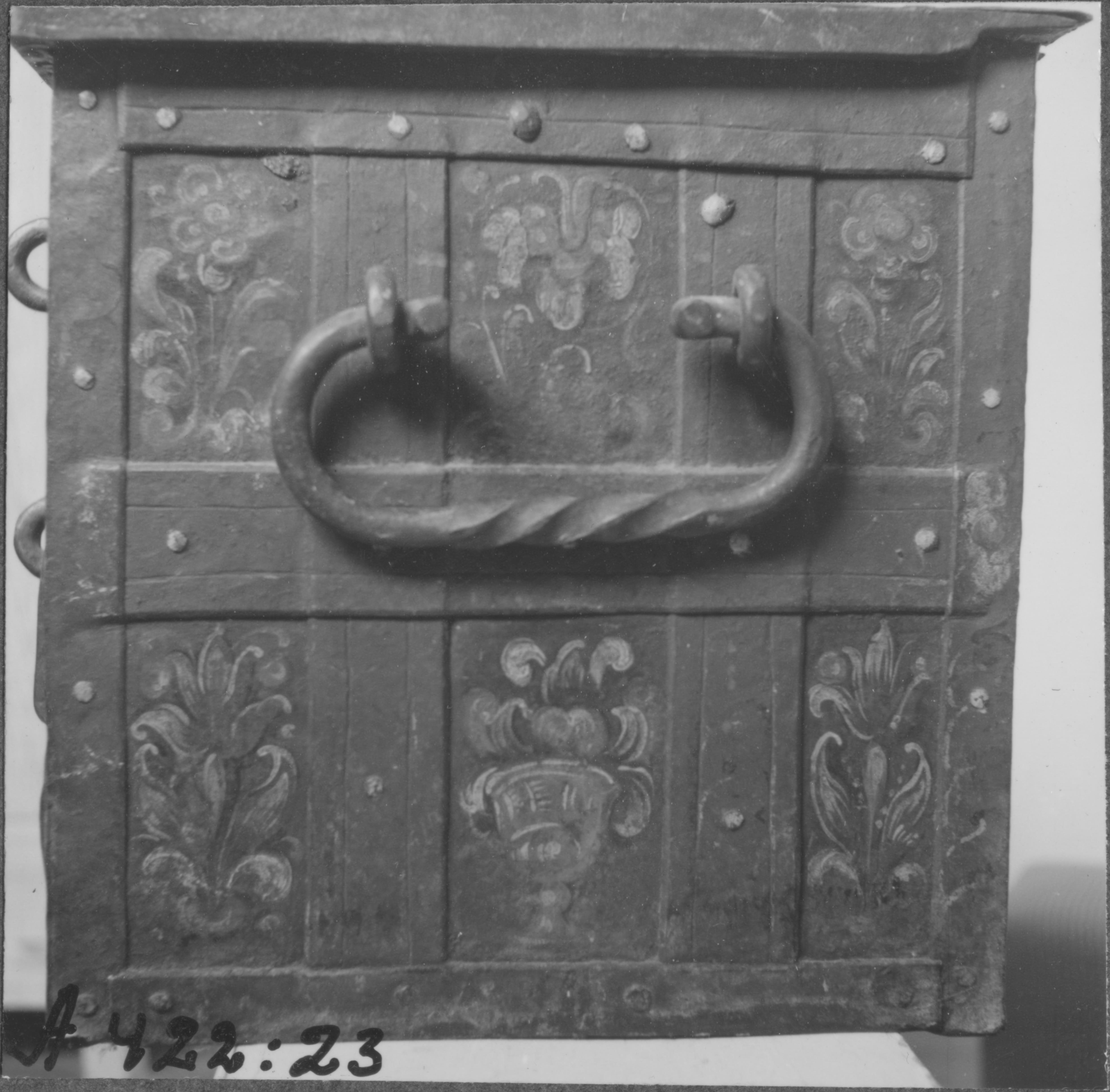 Beskrivning: Beskrivning: Kista av järn med järnbeslag i rutor. På locket står Anno 1791. På baksidan av kistan står årtalet 1591. Detalj.