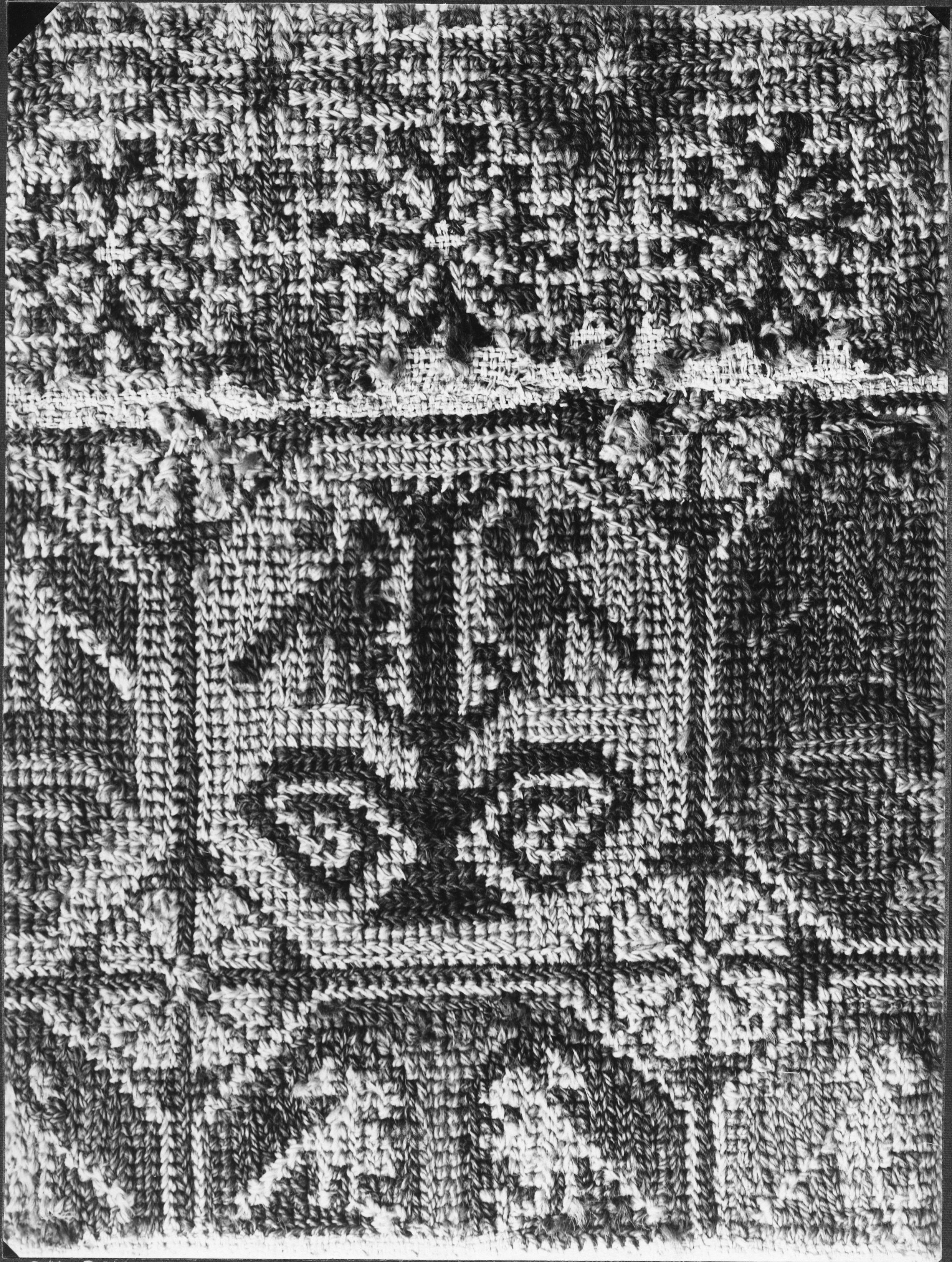 Beskrivning: Detalj av broderi på grovt linne i tvistsöm och korssöm. Kopierat efter senmedeltida broderi.
