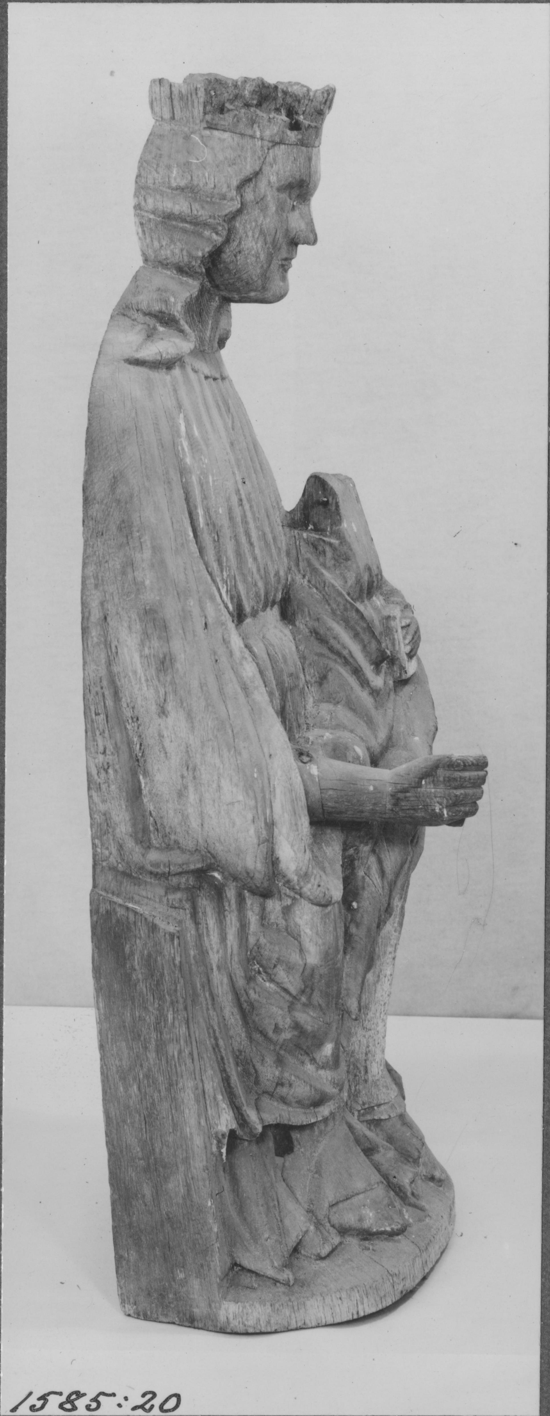 Beskrivning: Träskulptur av ek föreställande jungfru Maria med barnet. Barnets huvud och ena arm saknas. I den framsträckta högra handen har Maria hållit i något.