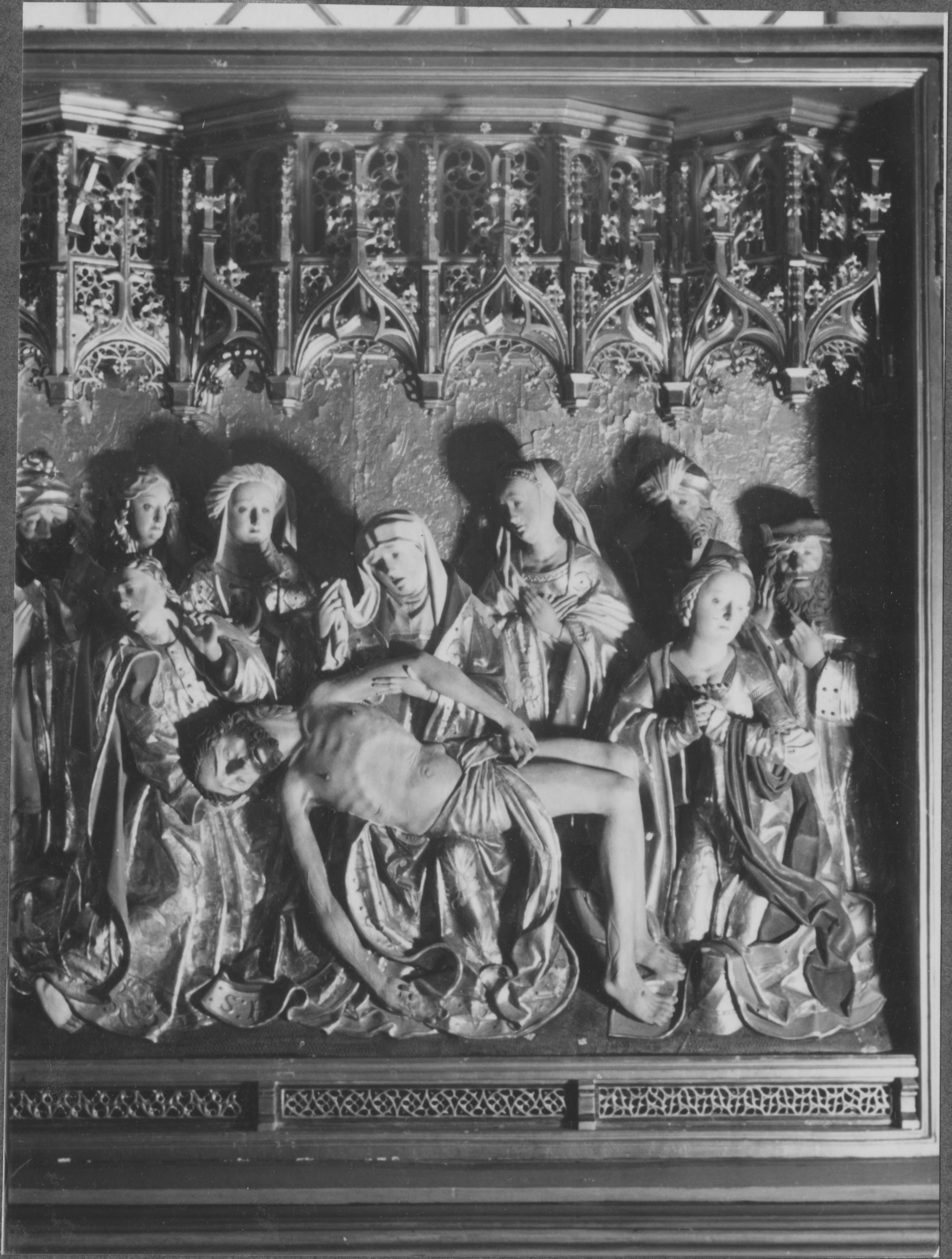 Beskrivning: Altarskåp av ek, krederat, förgyllt och målat. Corpus med en framställning av Kristi begråtande. Nordtyskt arbete från 1500-talet.