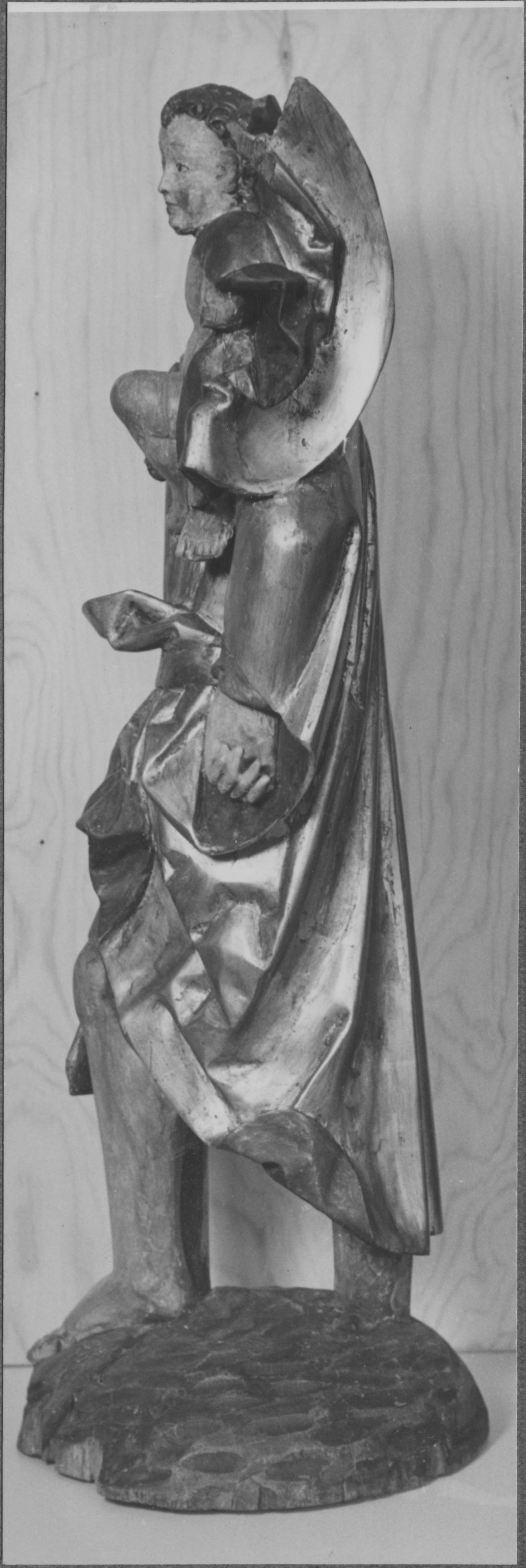 Beskrivning: Träskulptur föreställande S:t Kristoffer. Omkring 1500. Efter restaurering 1942.