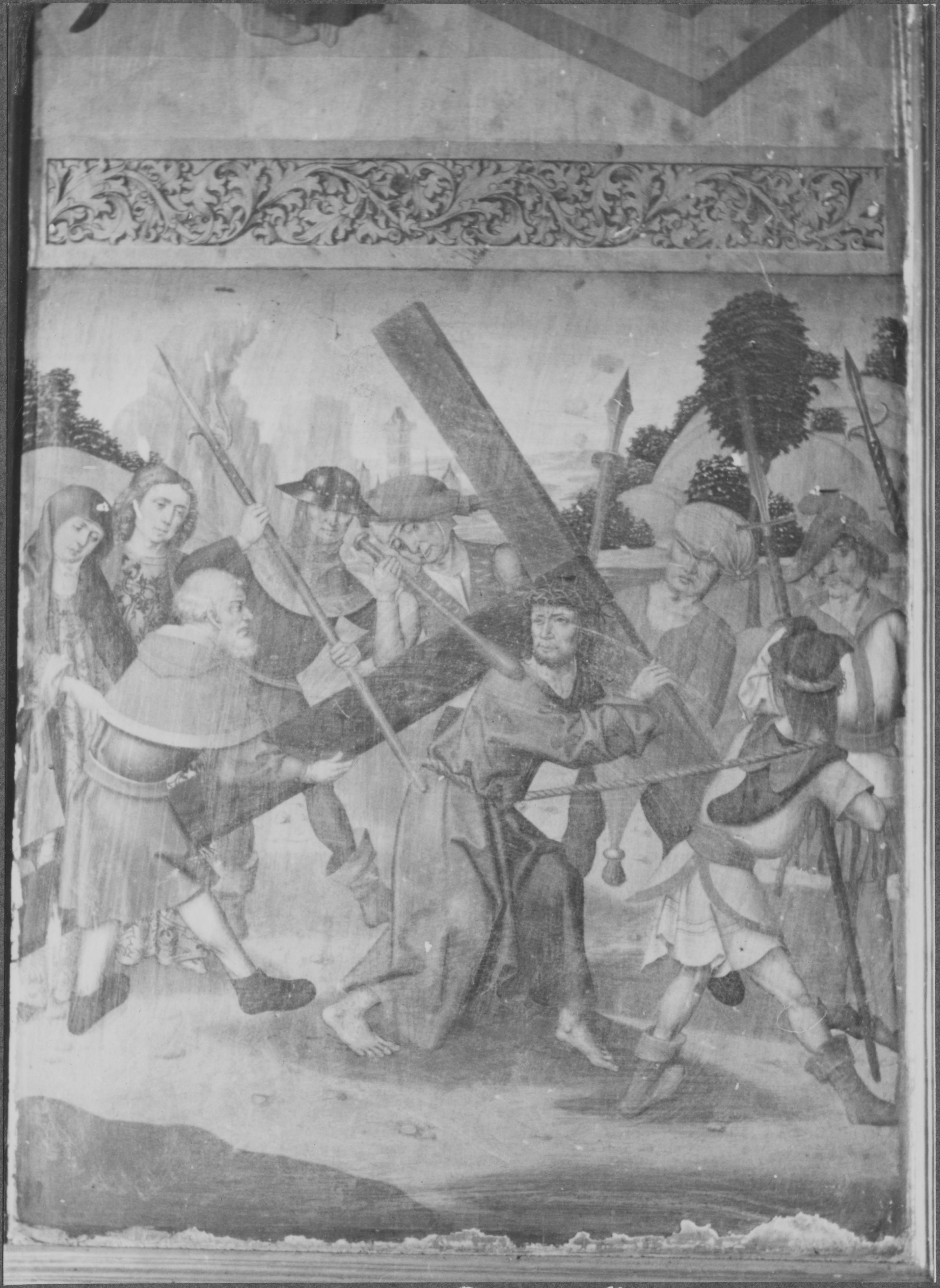 Beskrivning: Altarskåpsdörren, inre vänstra, utsidan. Detalj.