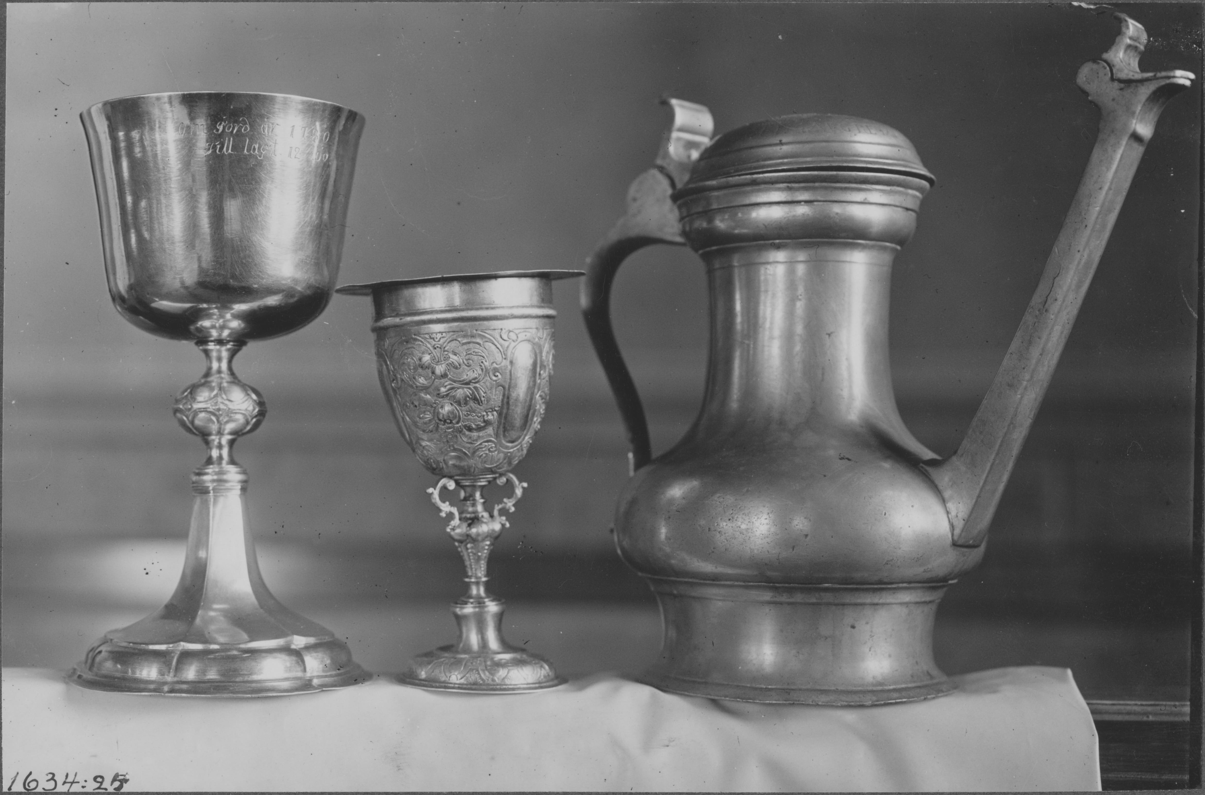 Beskrivning: Kalk av silver, cuppan förgylld. Sexpassformad fot, nod med driven ornering. Anno 1733, omgjord 1780. Sockenbudstyg av silver. Kalk med röd förgyllning, rund fot med drivna ornament. Cuppa med drivna brosk- och blomornament. Vinkanna av tenn. Bukig med grepe, snås och lock. Enligt inskrift skänkt 1815. Snabbinventering.