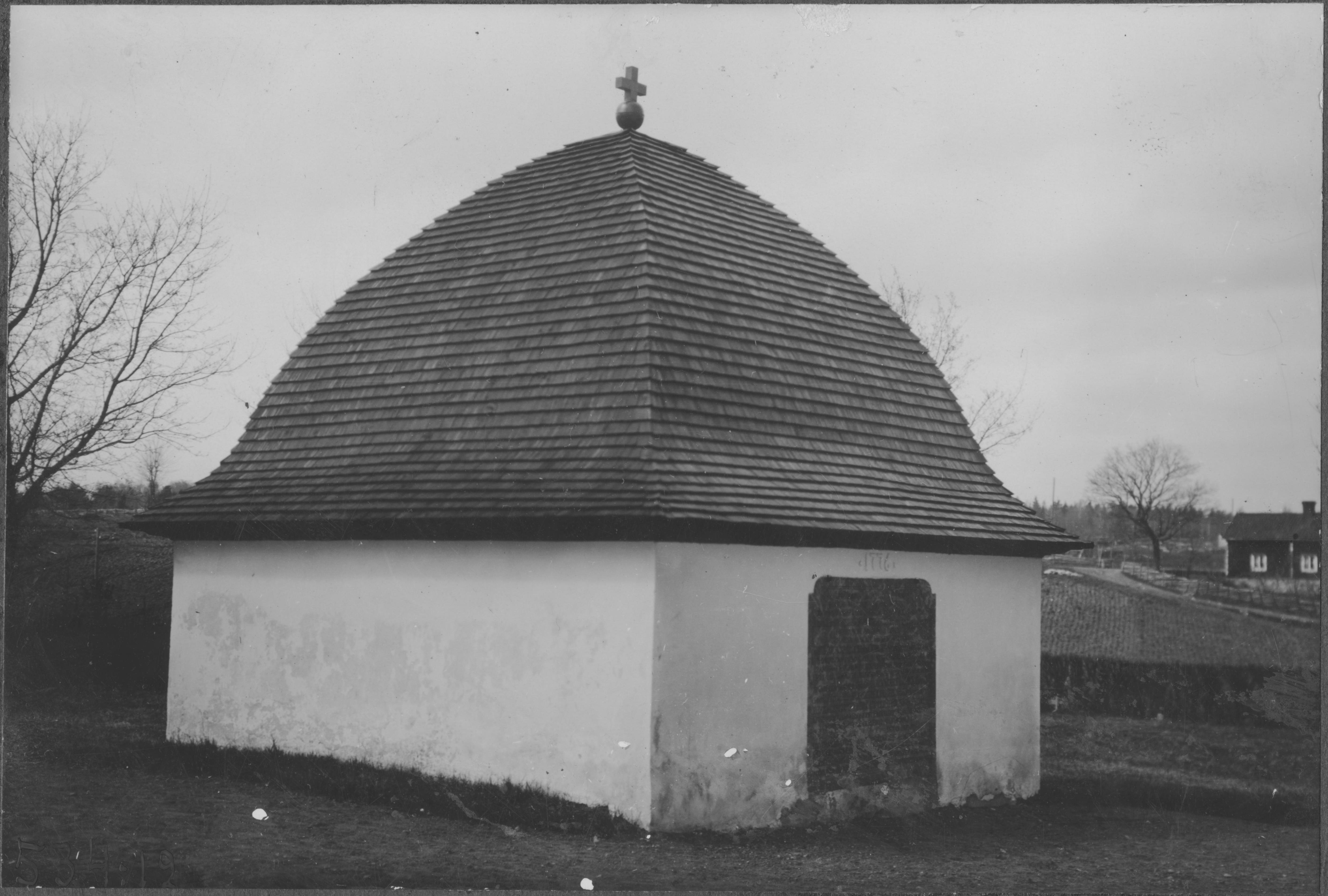 Beskrivning: Gravkor uppfört av släkten Grönhagen på Brandsnäs 1776. Kyrkans västra sida.