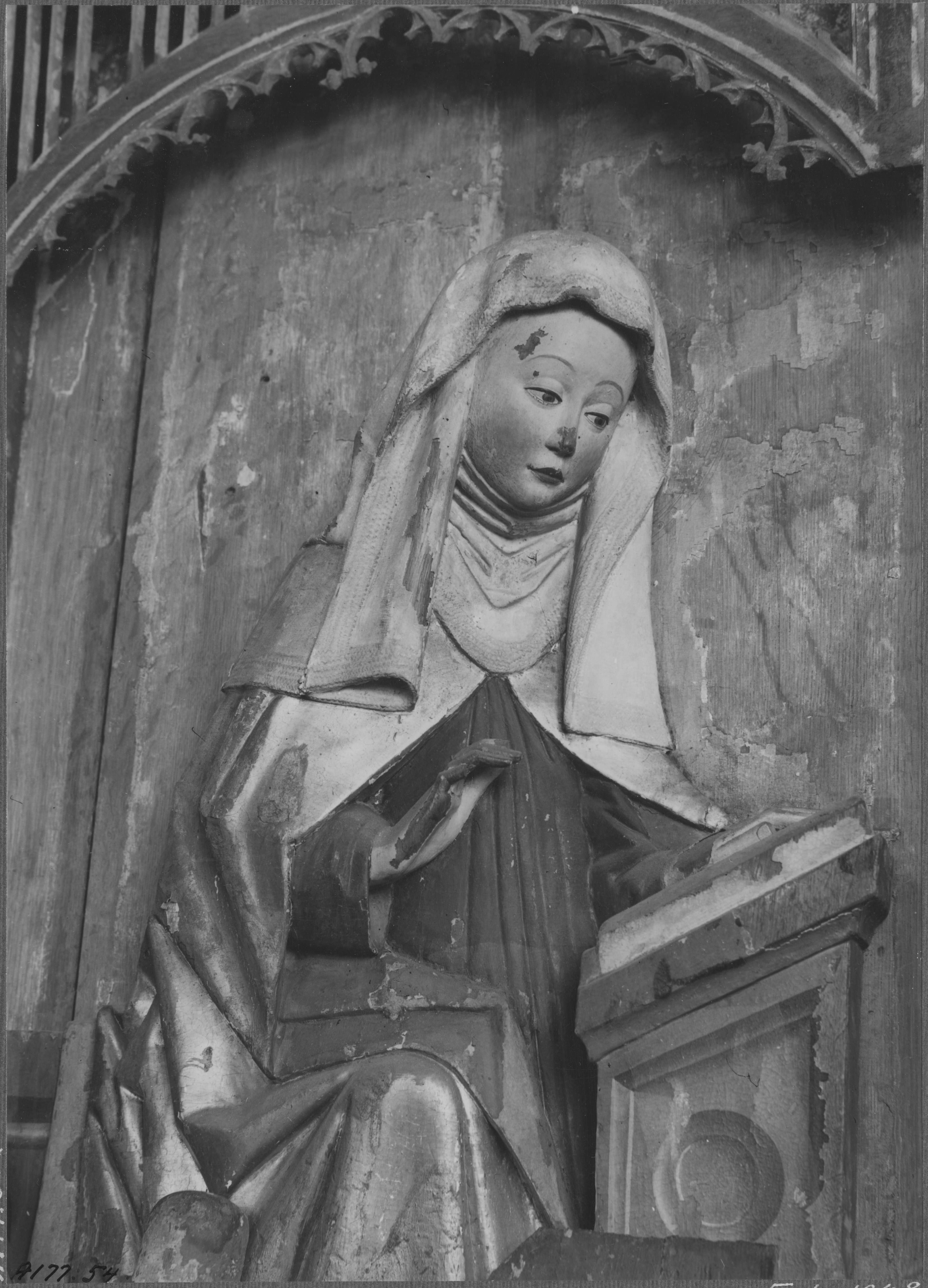 Beskrivning: Altarskåp i ek. Flera scener fragmentariska och många helgon i corpus övre del förlorade. Detalj av corpus. Senmedeltid.