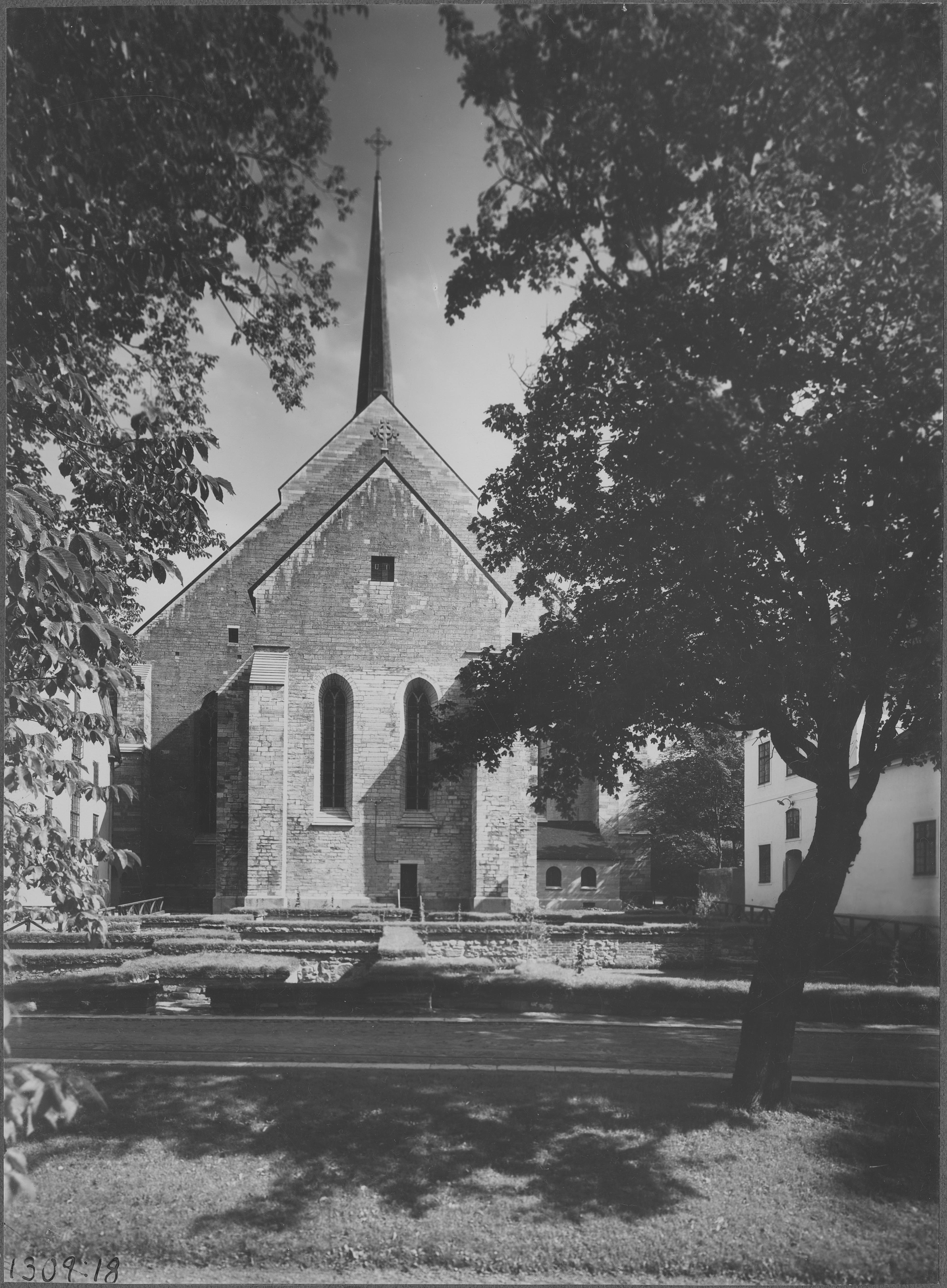 Beskrivning: Kyrkan från väster. sakristian i högra hörnet av kyrkan. Munkklostret till höger.