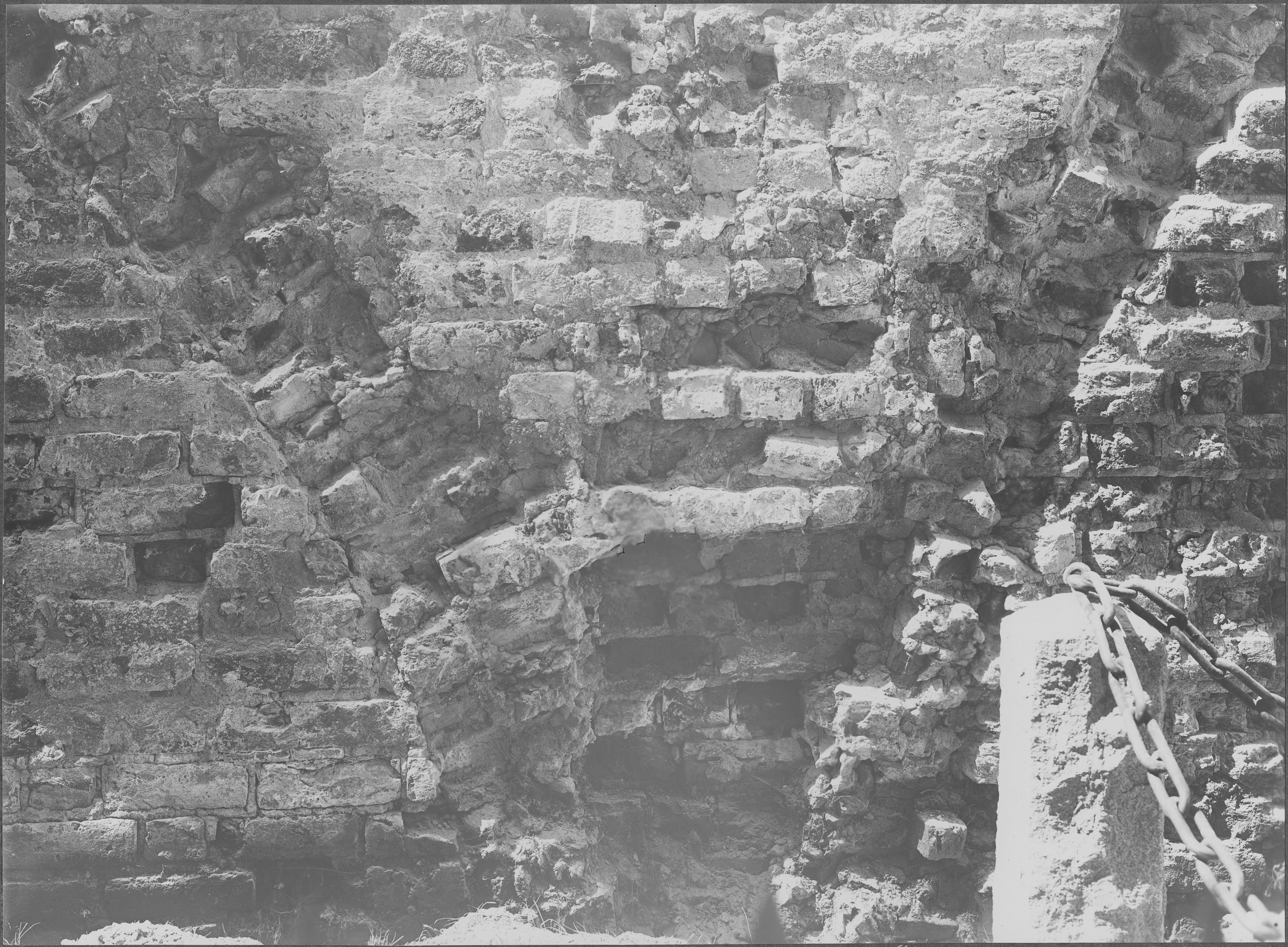 Beskrivning: Portmuren efter putsens avlägsnande 1941. Detalj; partiet där de gamla valvspåren möts. Från öster.