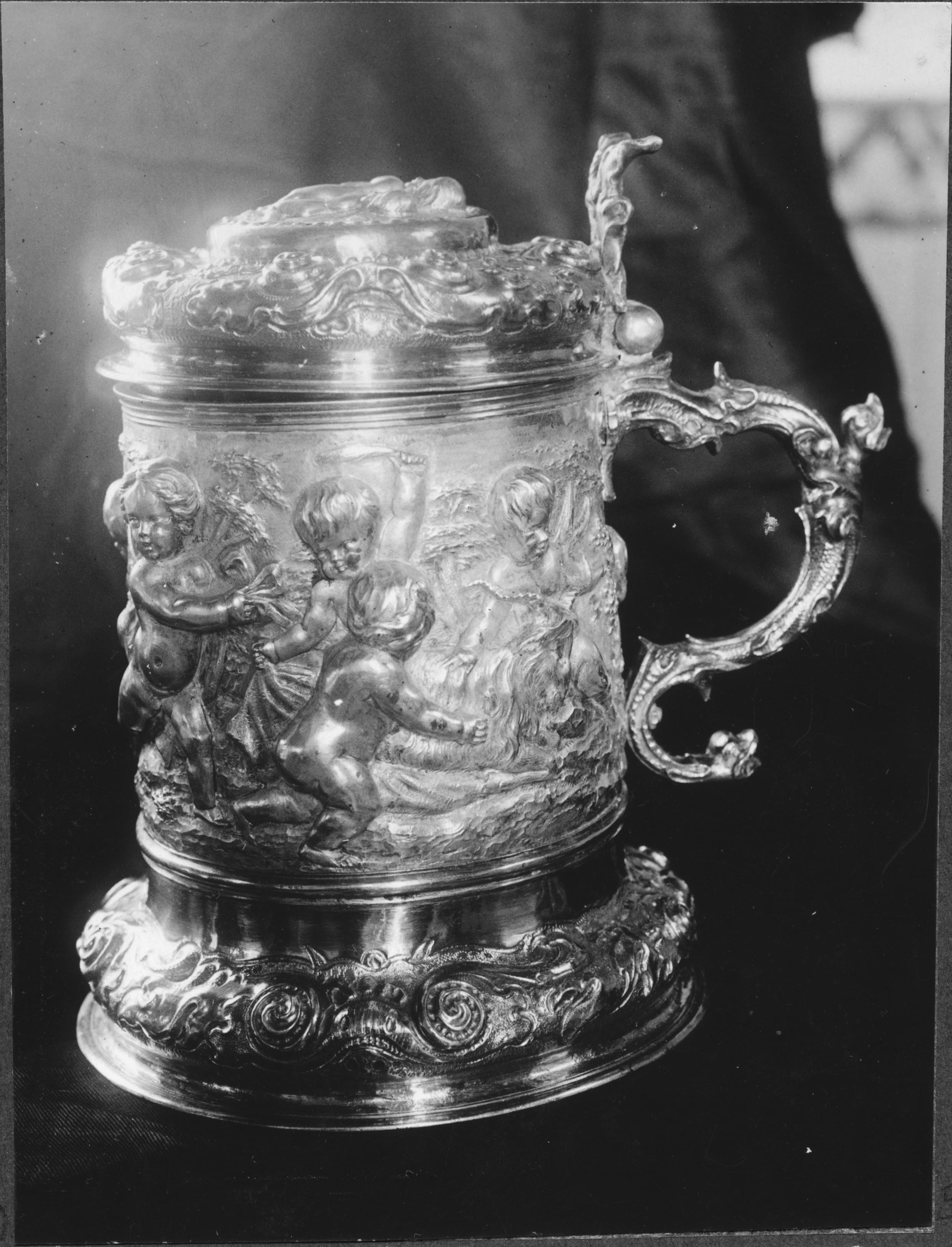 Beskrivning: Kanna av silver, till större delen förgylld. Dekorerad med barnfigurer lekand ei ett landskap samt pressade och punsade ornament i broskstil. Högt drivet arbete. Omkring 1650, snabbinv.