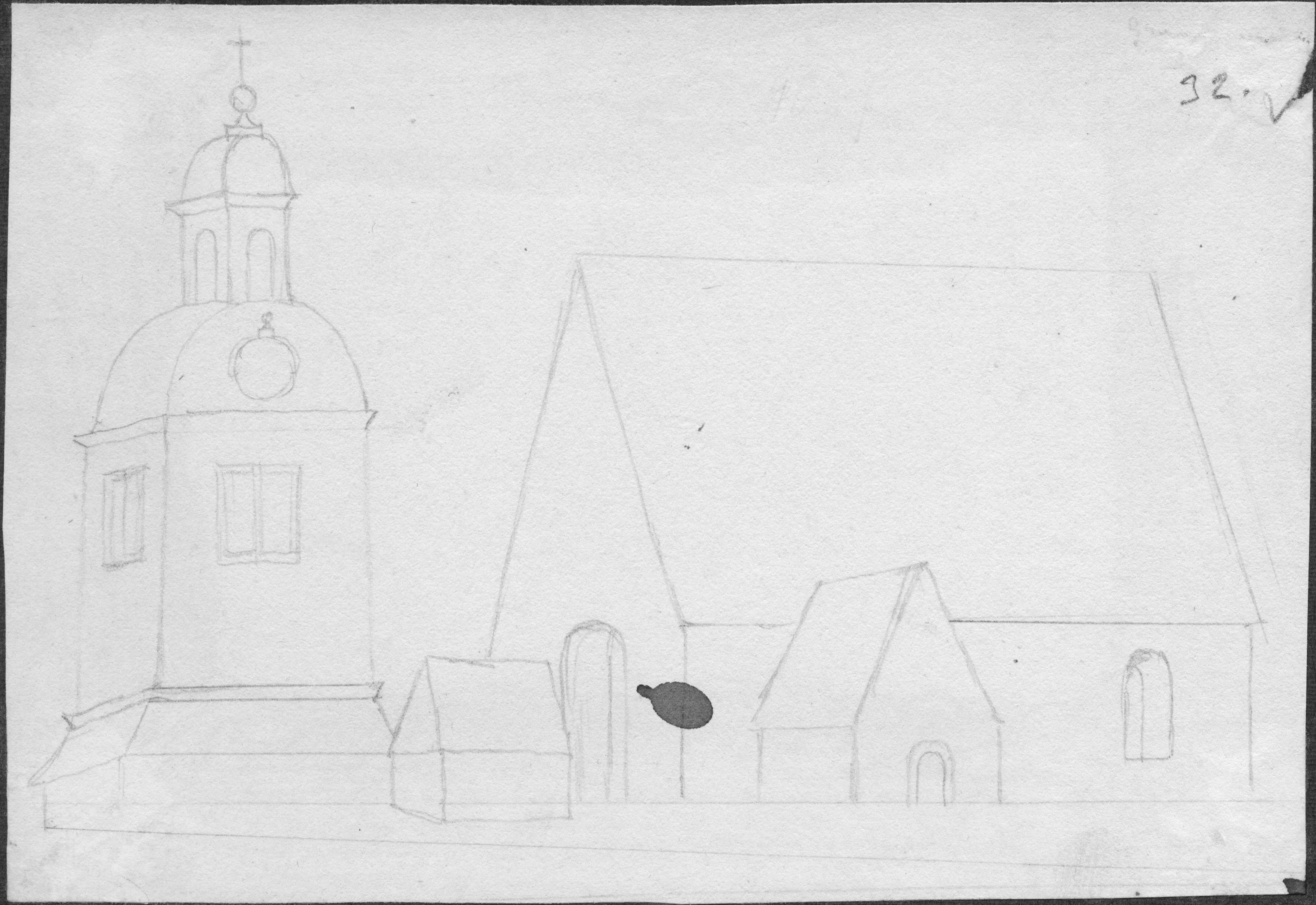 Beskrivning: Teckning av kyrkan. Ohlson: "Ångermanlands kyrkor ritade 1828". Ekdahls samling.