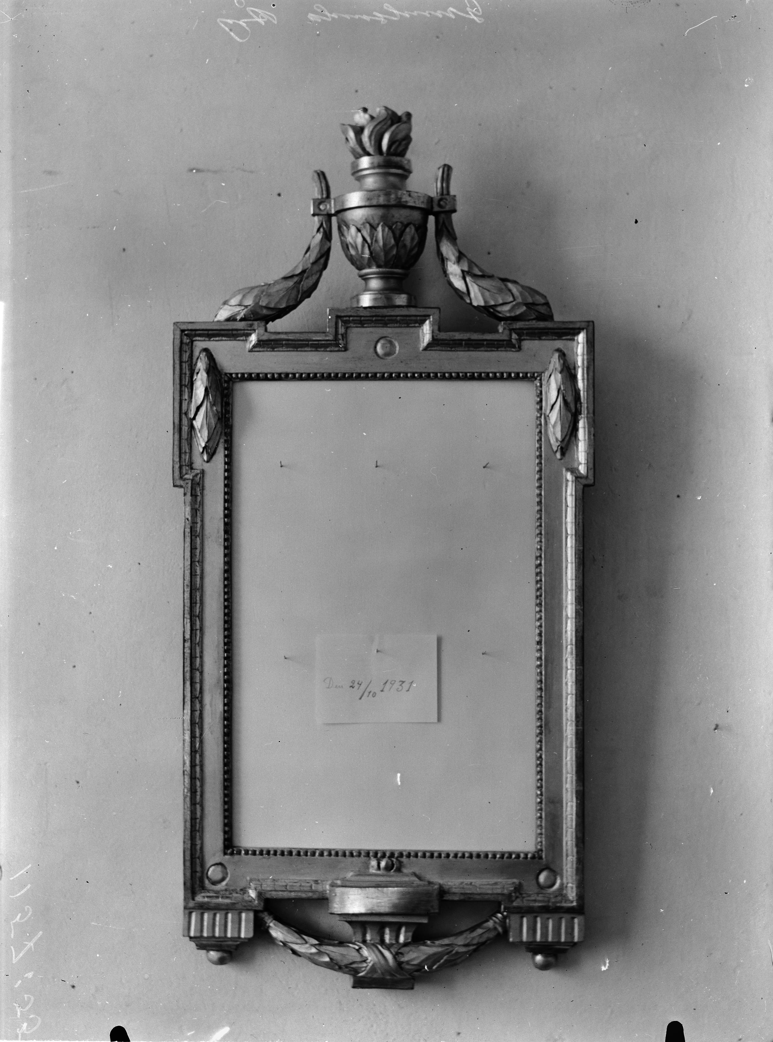 Beskrivning: Nummertavla, av trä. Förgylld ram i gustaviansk stil. Upptill eldsurna och girlang, nedtill girlang. 1700-talets slut, snabbinv. Efter restaurering 1931.