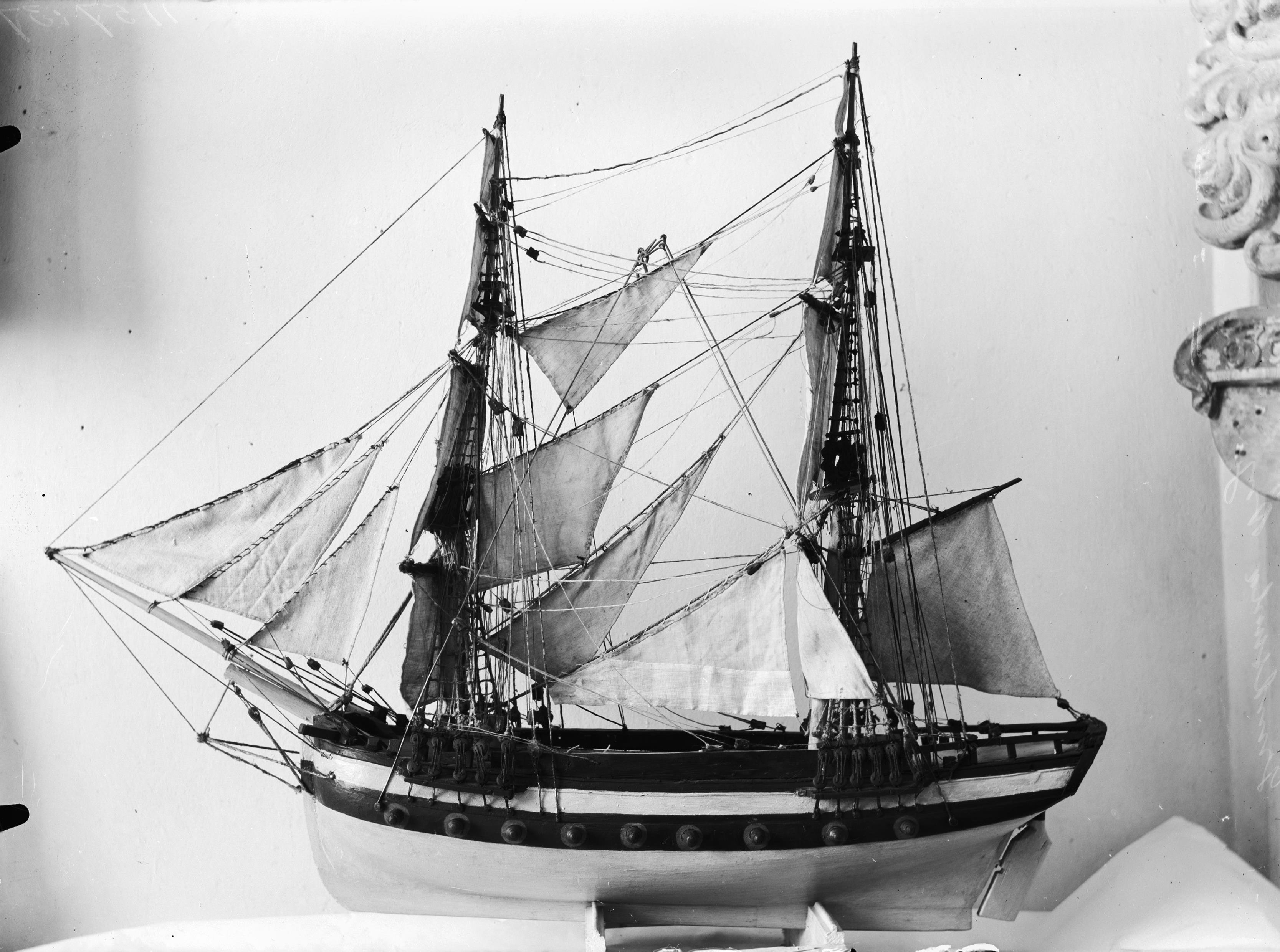 Beskrivning: Votivskepp, av trä. Två master med segel. Bestyckad med kanoner. 1600-talet, snabbinv. Efter konservering 1931.